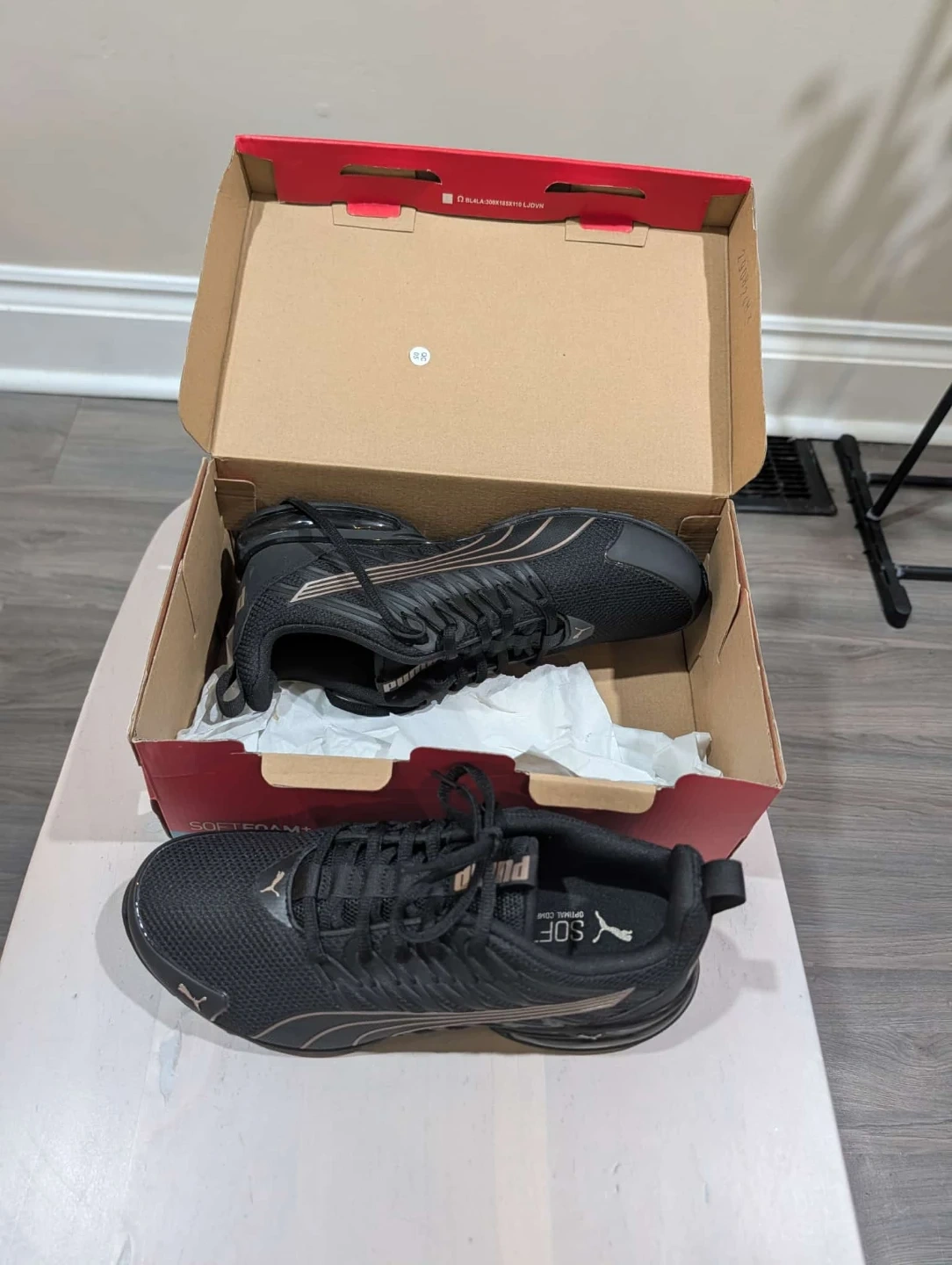 These are Puma Voltaic Evo running shoes in a women's wide fit. They feature SoftFoam+ optimal comfort and come in black with gold accents. Original price was $120.