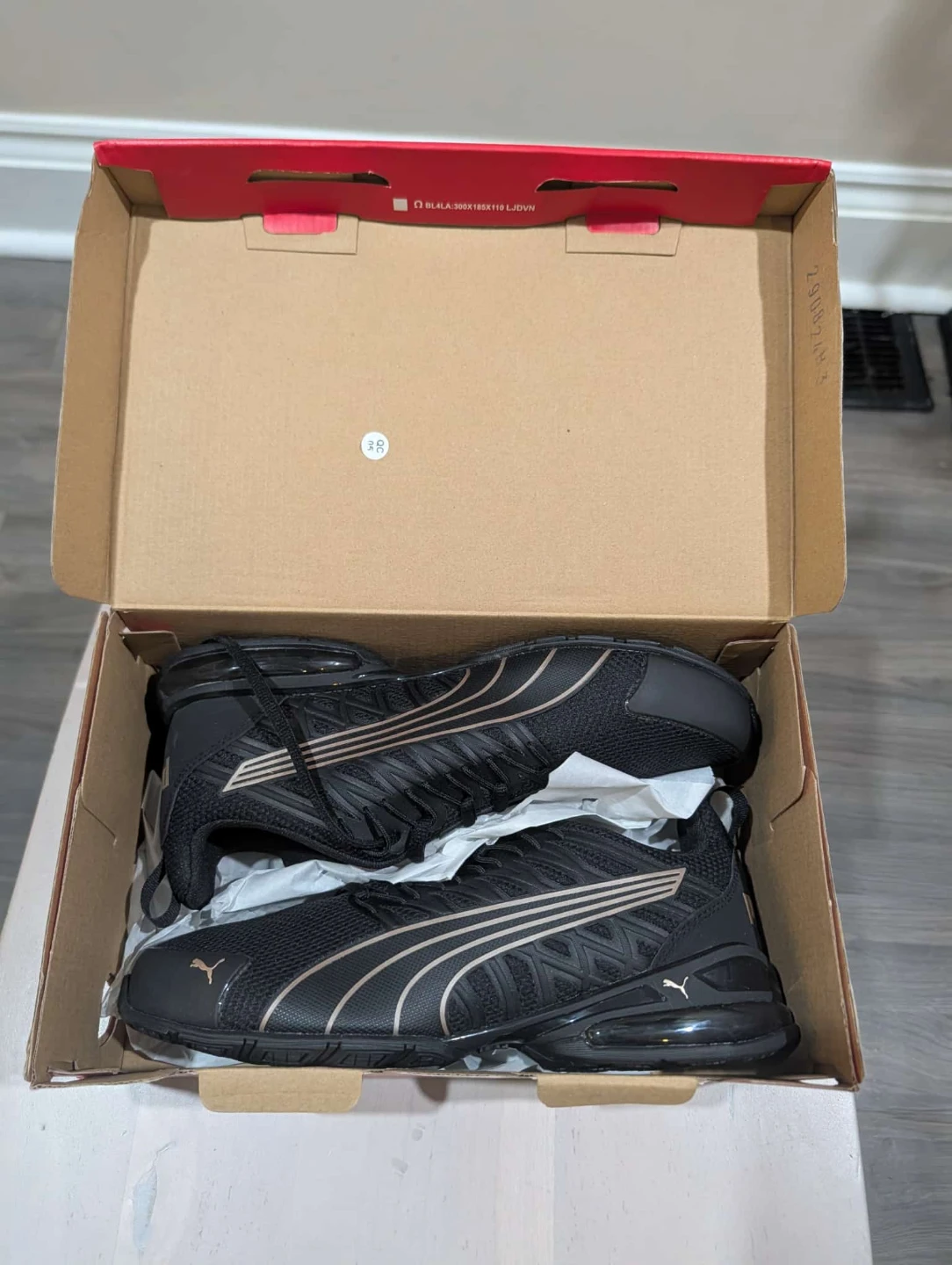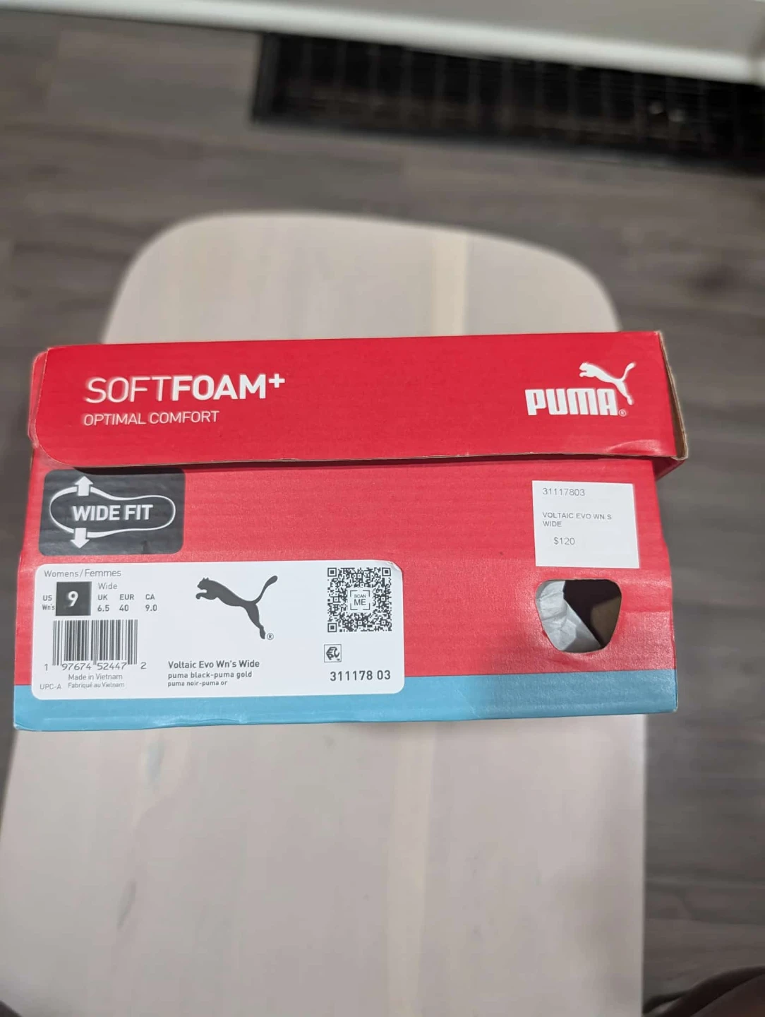These are Puma Voltaic Evo running shoes in a women's wide fit. They feature SoftFoam+ optimal comfort and come in black with gold accents. Original price was $120.