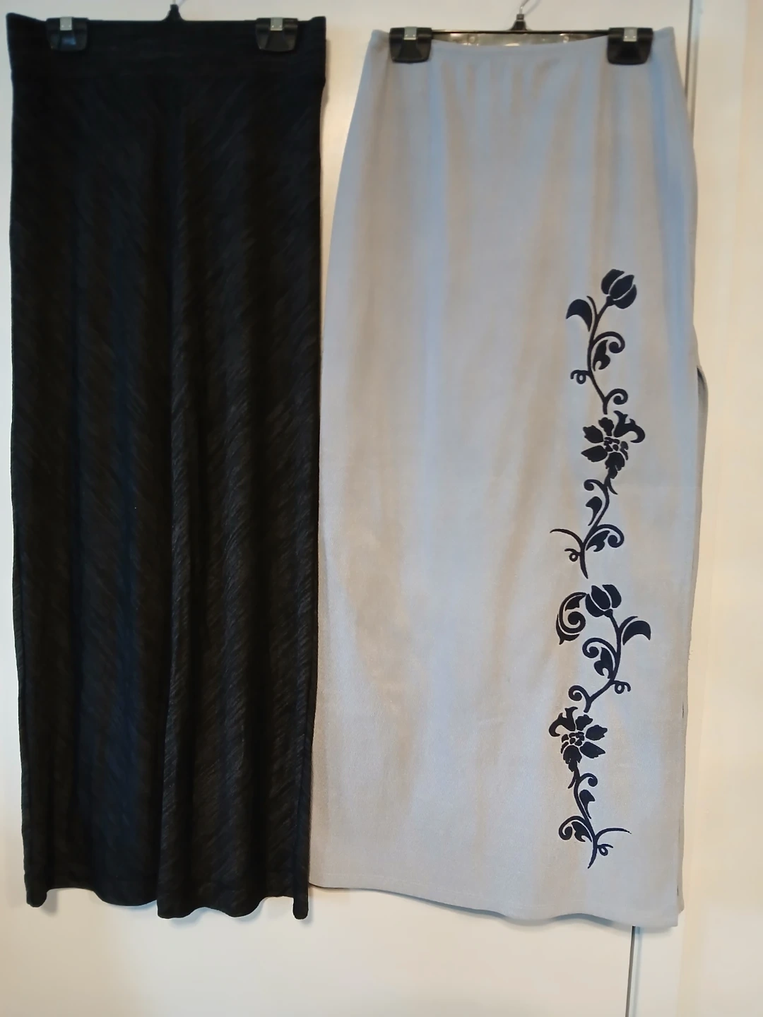 This listing includes two skirts. One is a black skirt with a subtle textured pattern. The other is a light blue skirt with a dark blue floral vine design on one side. Both skirts are a simple pull-on style.
