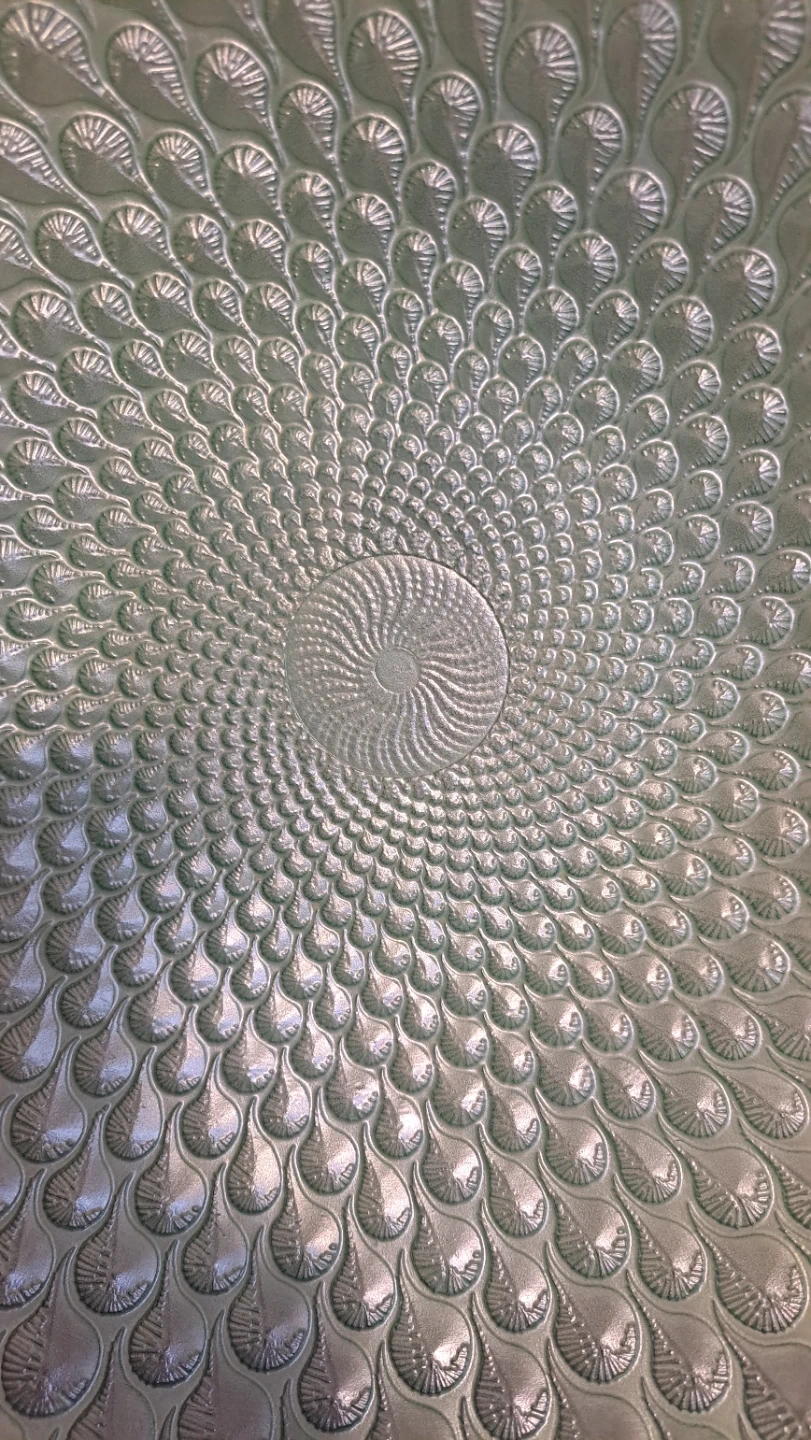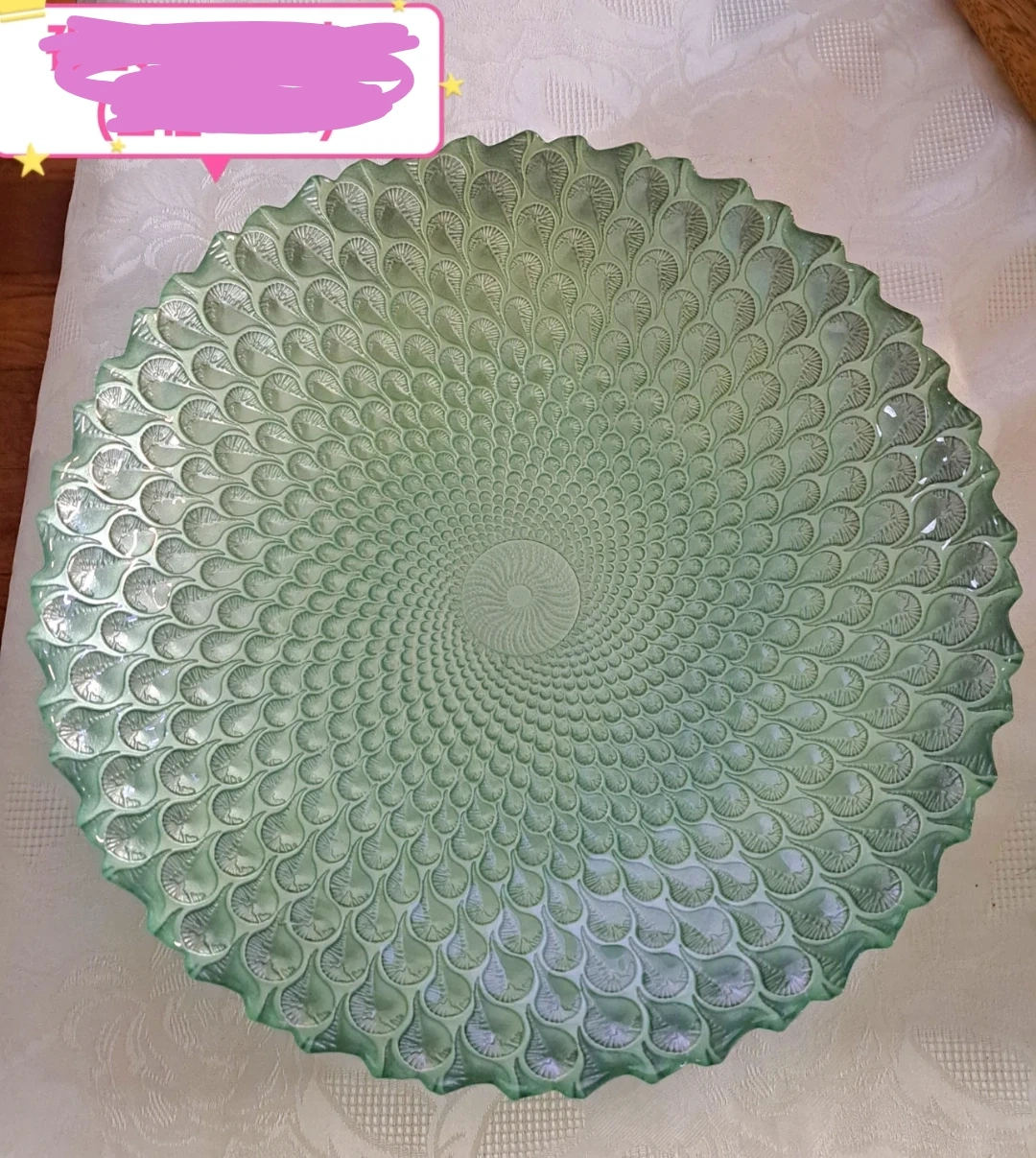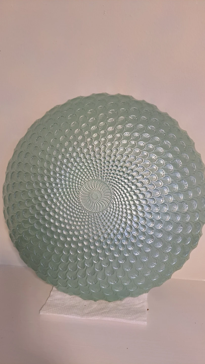 A decorative glass serving platter with a unique, embossed spiral peacock