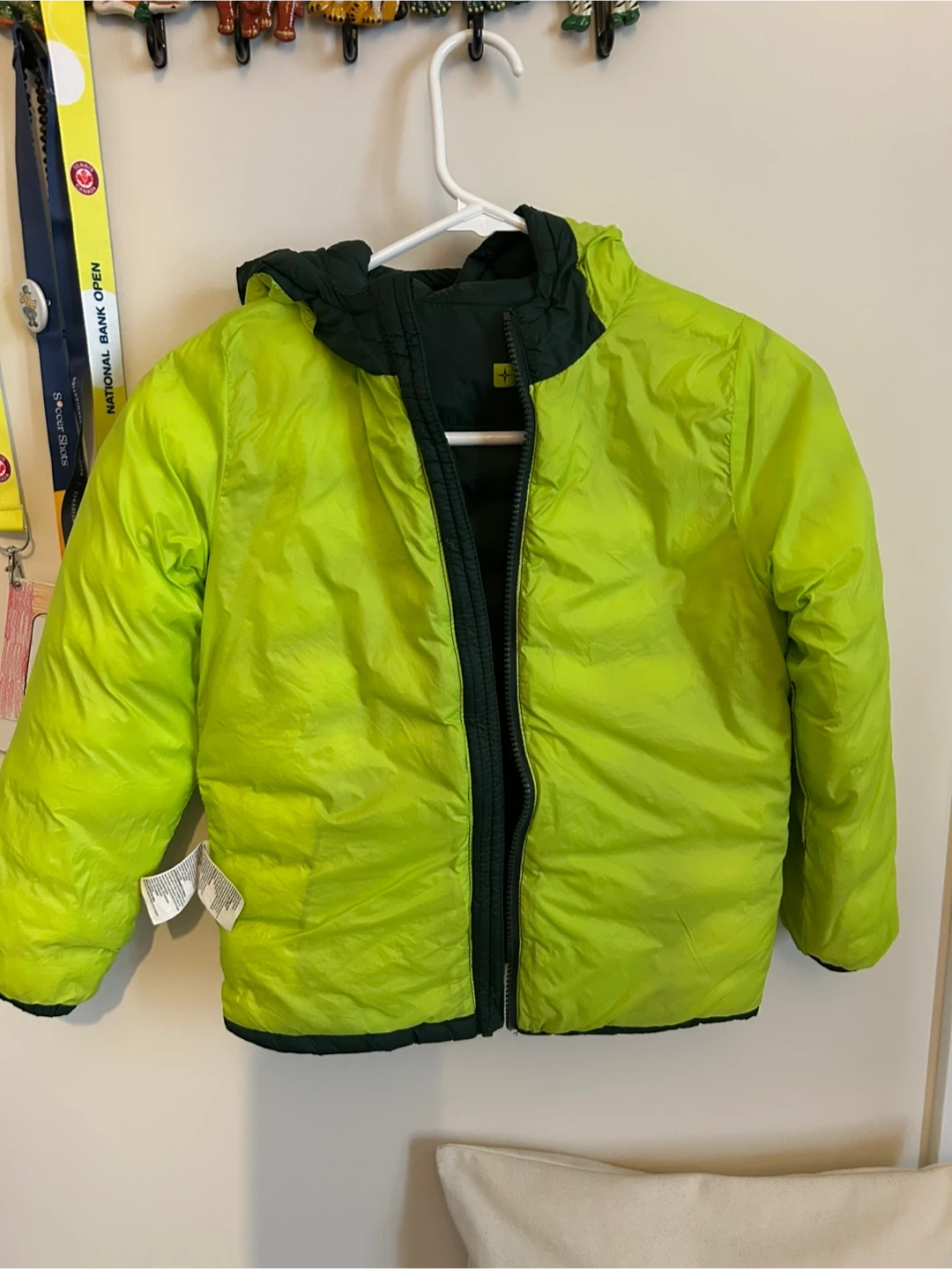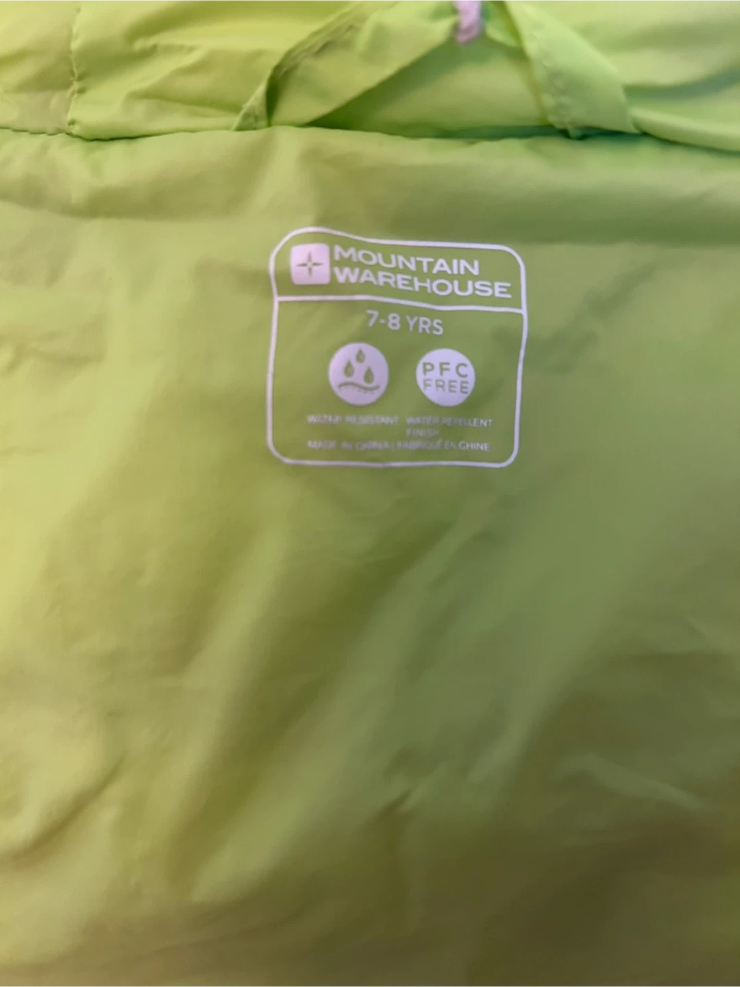 puffer jacket in green and bright lime. It's water-repellent and PFC-free. This jacket is suitable for ages 7-8 years.