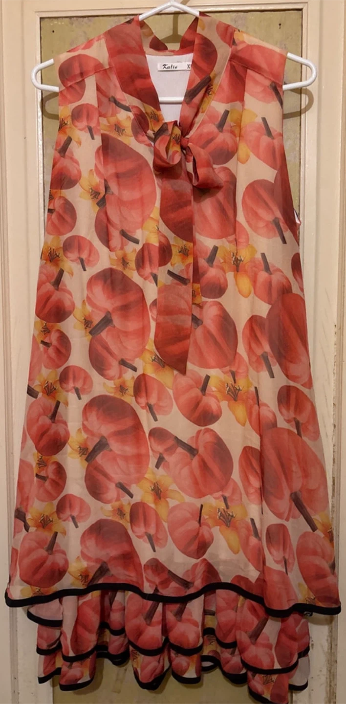 Add a pop of colour to your wardrobe with this Katie dress, showcasing a vibrant floral pattern and a flattering tie-neck design. This dress never been worn and the size is XL. The dress is made from 95% rayon and 5% cotton, offering a comfortable and breathable fit.