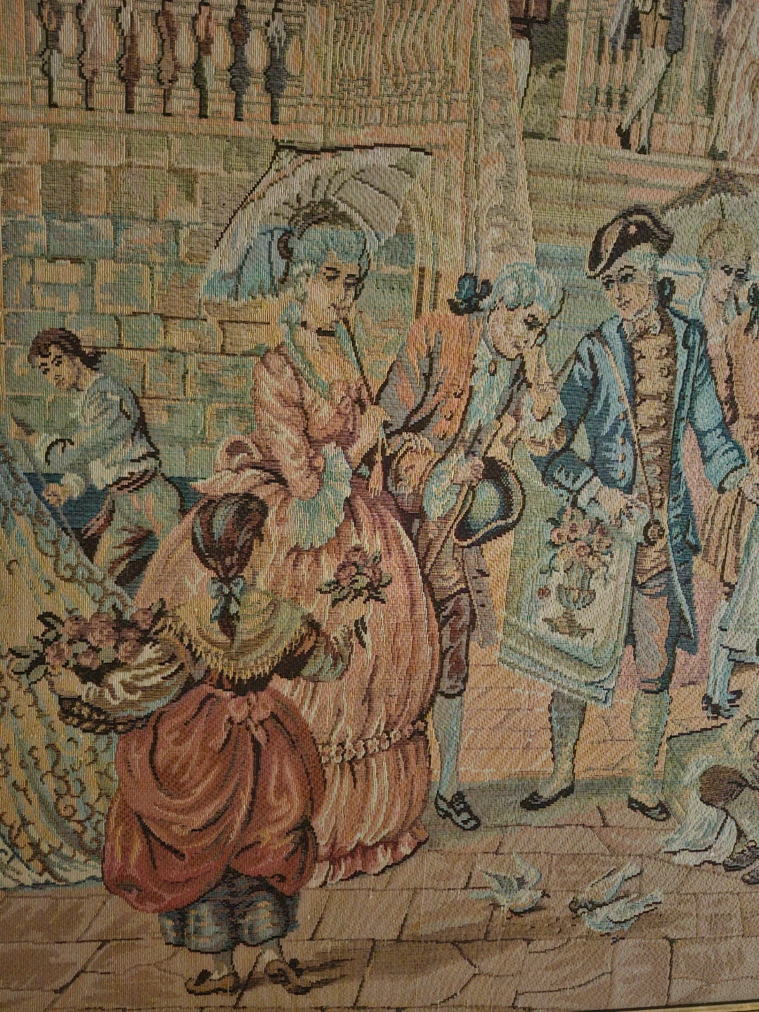 Beautifully framed Florintine original tapestry from Italy. Framed in antique wood. Measures 4'x8" H and 3'x5" W. Prestine condition. Already wired and ready to hang.