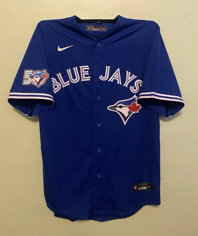 Show your team pride with this brand-new, limited edition Toronto Blue Jays 50th Anniversary baseball jersey! This jersey features the team's iconic logo and 50th anniversary patch, making it a must-have for any true Jays fan. Displaying the official Nike logo, this jersey makes a statement wherever you go. It's always a good idea to check the fit and feel in person to ensure it meets your expectations! If the ad is still up, yes, it's still available!