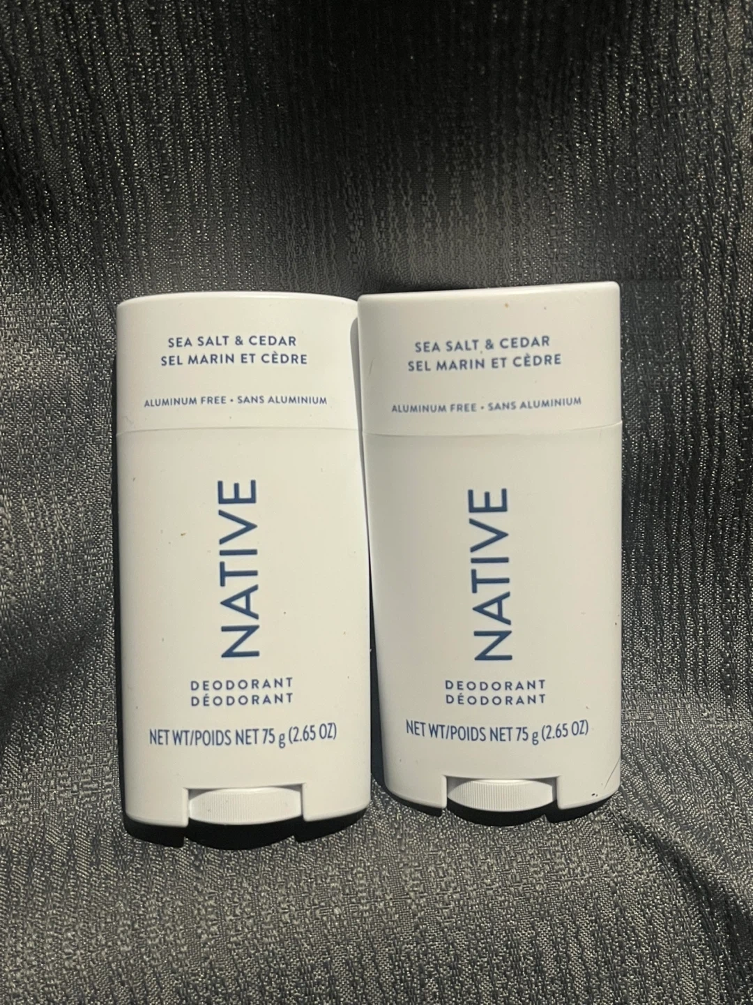 This is a set of two Native deodorants in the Sea Salt & Cedar scent. Each deodorant is 75g and aluminum-free. It's formulated with ingredients like Shea Butter and Coconut Oil.