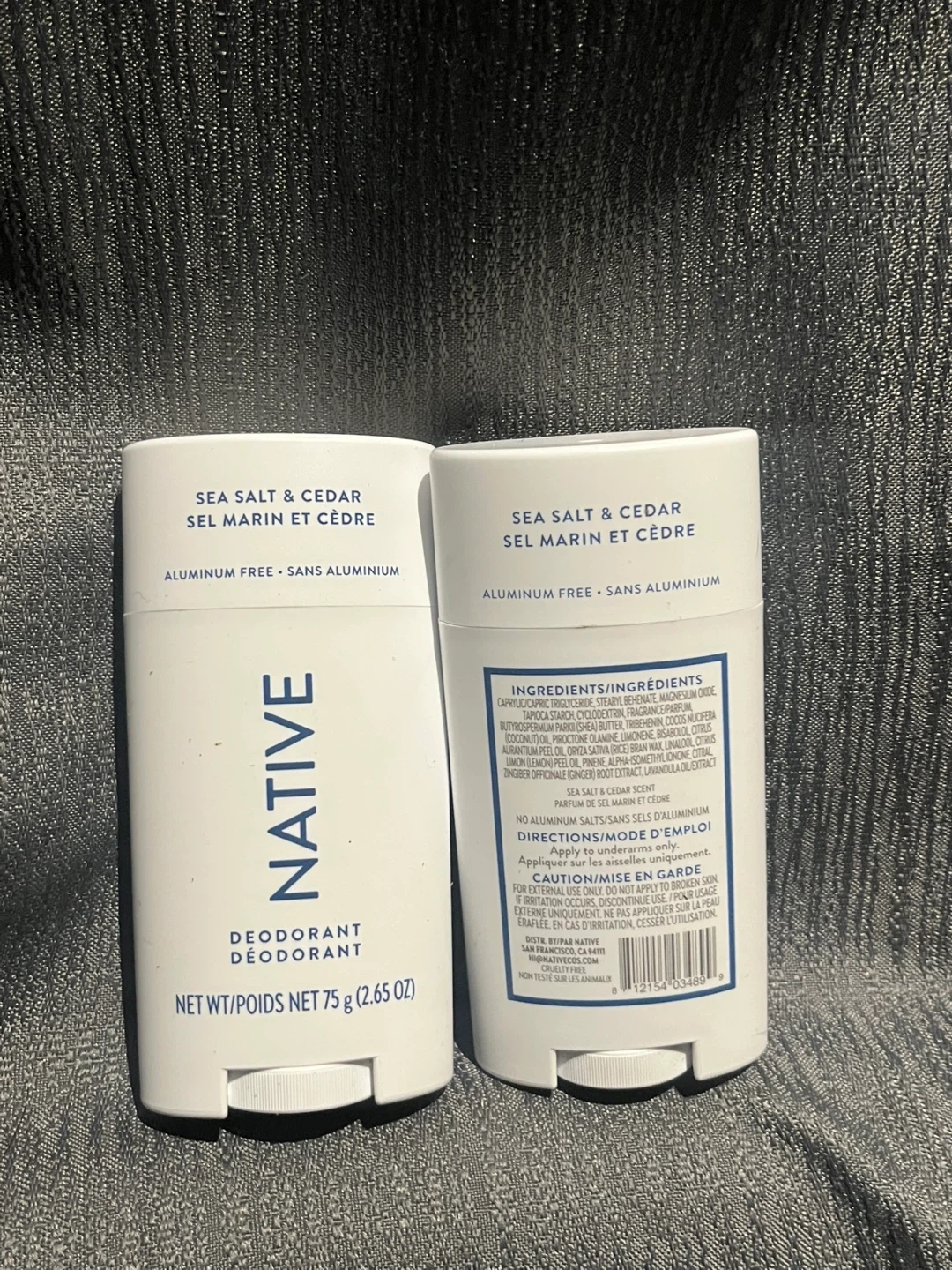 This is a set of two Native deodorants in the Sea Salt & Cedar scent. Each deodorant is 75g and aluminum-free. It's formulated with ingredients like Shea Butter and Coconut Oil.