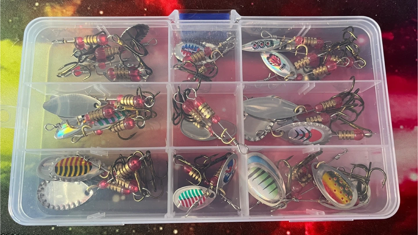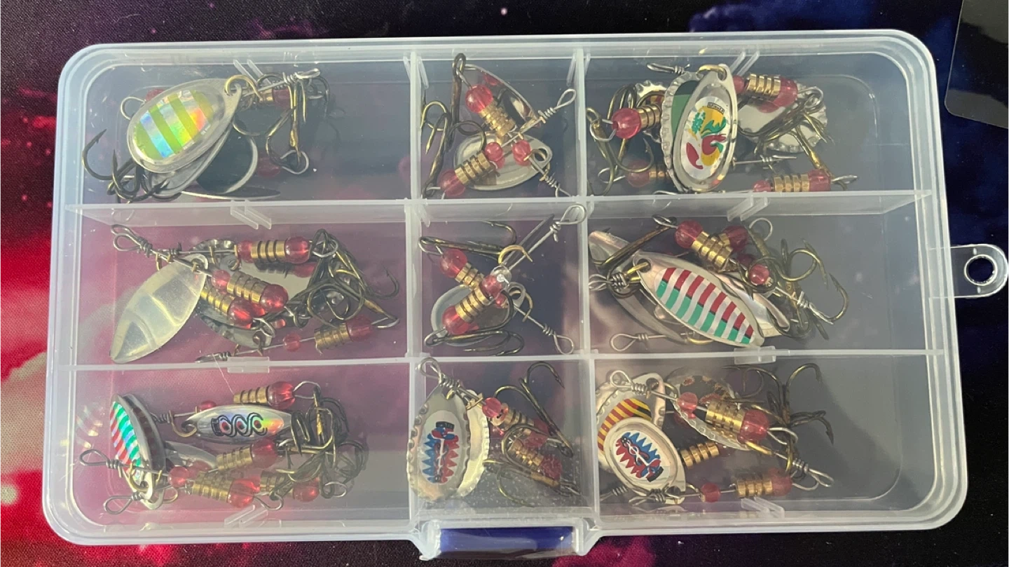 This is a set of assorted fishing lures in a clear tackle box. The lures have various colourful designs with red bead accents and treble hooks. It's a convenient way to organize your tackle for a day out fishing!