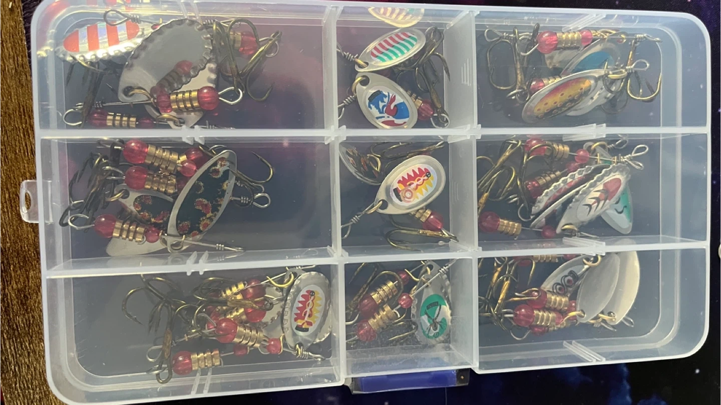 This is a set of assorted fishing lures in a clear tackle box. The lures have various colourful designs with red bead accents and treble hooks. It's a convenient way to organize your tackle for a day out fishing!