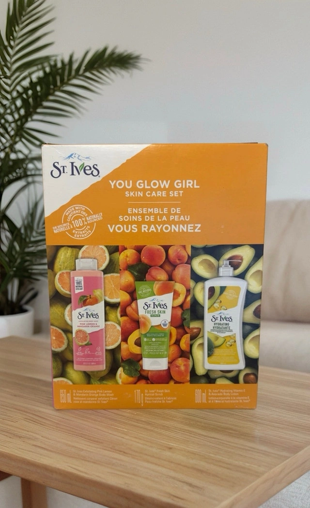 15This St. Ives You Glow Girl Skin Care Set includes an exfoliating pink lemon and mandarin orange body wash, fresh skin apricot face scrub, and hydrating vitamin E and avocado body lotion. The set is brand new and ready to give your skin a radiant glow. * Exfoliating Pink Lemon & Mandarin Orange Body Wash * Fresh Skin Apricot Face Scrub * Hydrating Vitamin E & Avocado Body Lotion This skincare set is ready to find a new home! If the ad is up, the item is available.