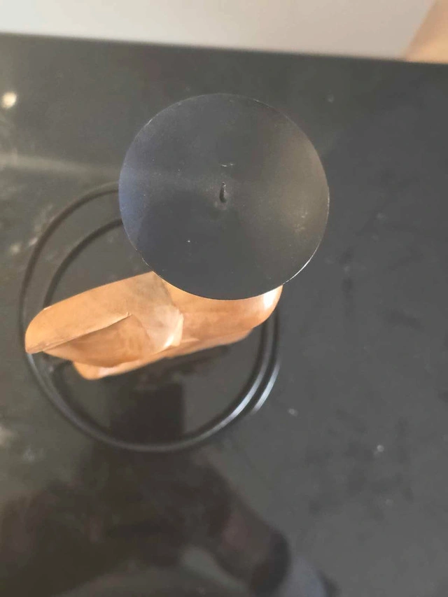 75Add a touch of unique artistry to your home with this St. Thomas hand-carved wooden candle holder. The candle holder features an abstract design with a metal candle plate set on a black metal frame, signed 'St. Thomas' by the artist, and is in great condition. It is a beautiful piece of folk art that will add warmth and character to any room. Approximate measurements: - Height: 7 inches - Width: 4 inches - Depth: 3 inches This candle holder would look lovely on your table, shelf, or mantle piece. It holds one candle and has an overall minimalist and clean aesthetic.