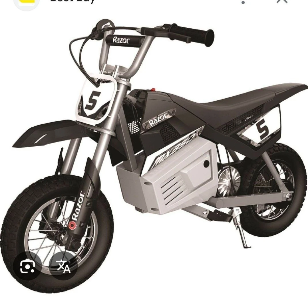 Razor MX350 electric dirt bike. Chain-driven motor with twist-grip throttle. Speeds up to 15 mph. Rechargeable battery included.