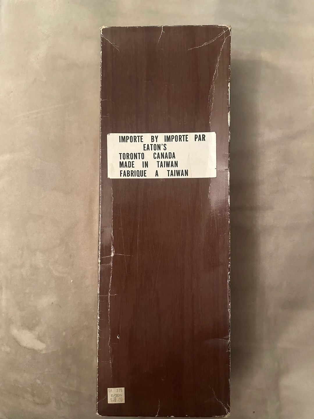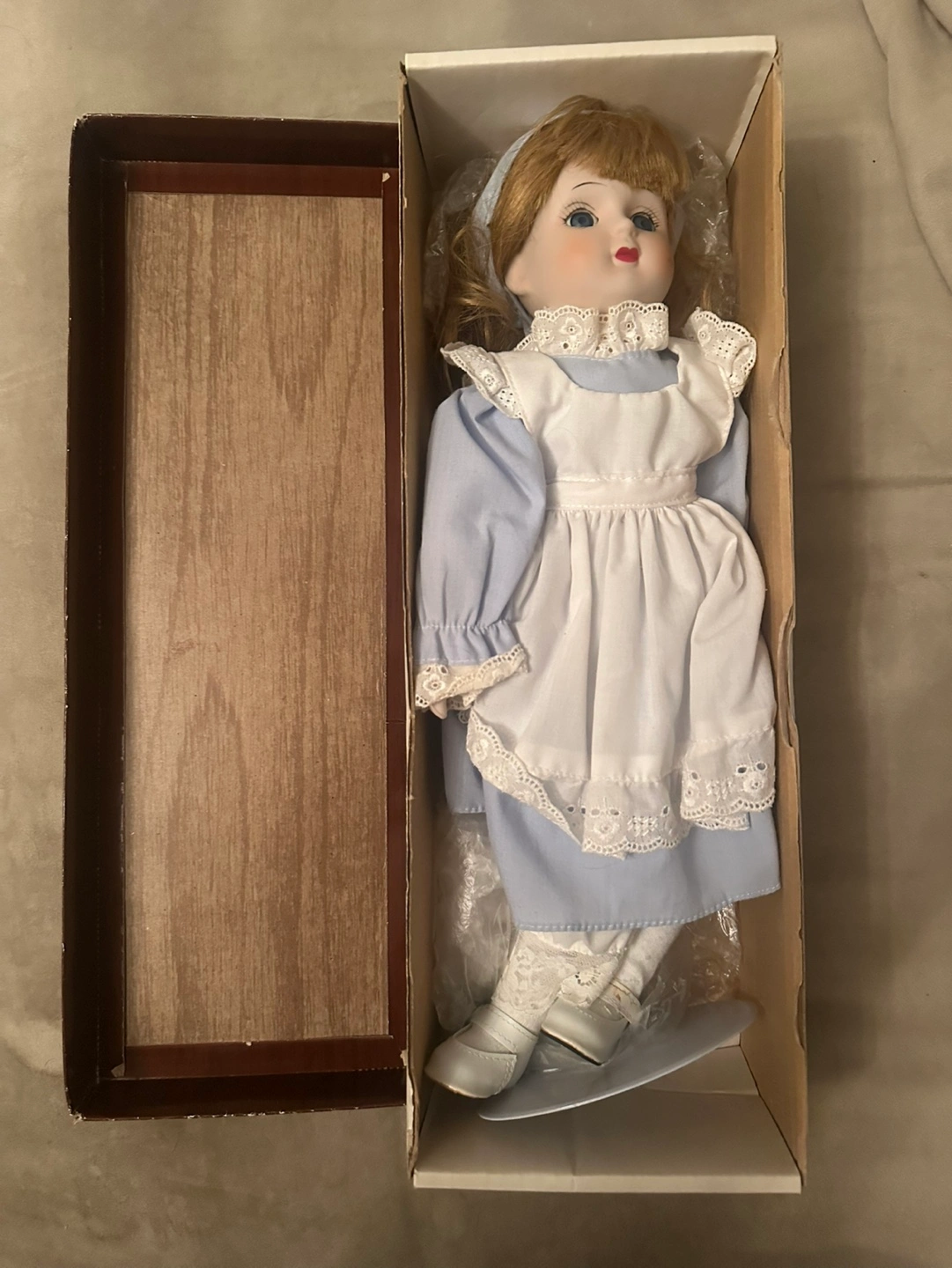 Collectible vintage porcelain doll in light blue dress and white apron with lace details, blonde hair, & white shoes. Doll comes in original box and includes a display stand. Made in Taiwan, imported by Eaton's. Originally priced at $40.00