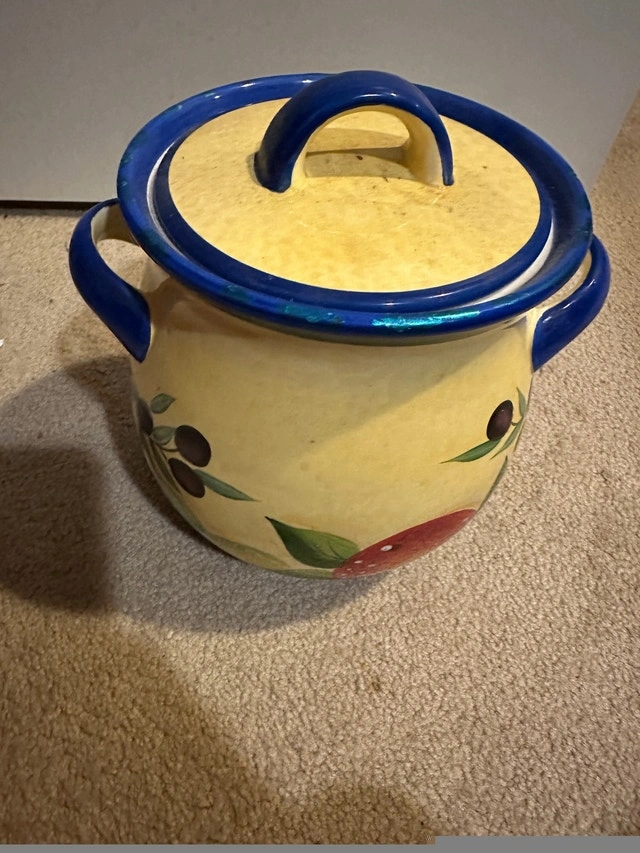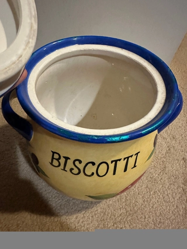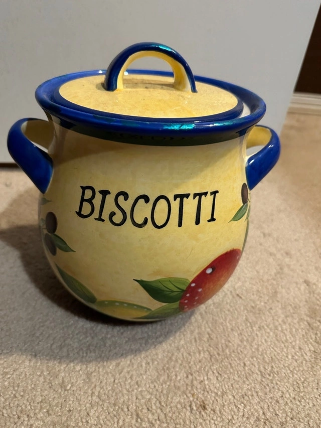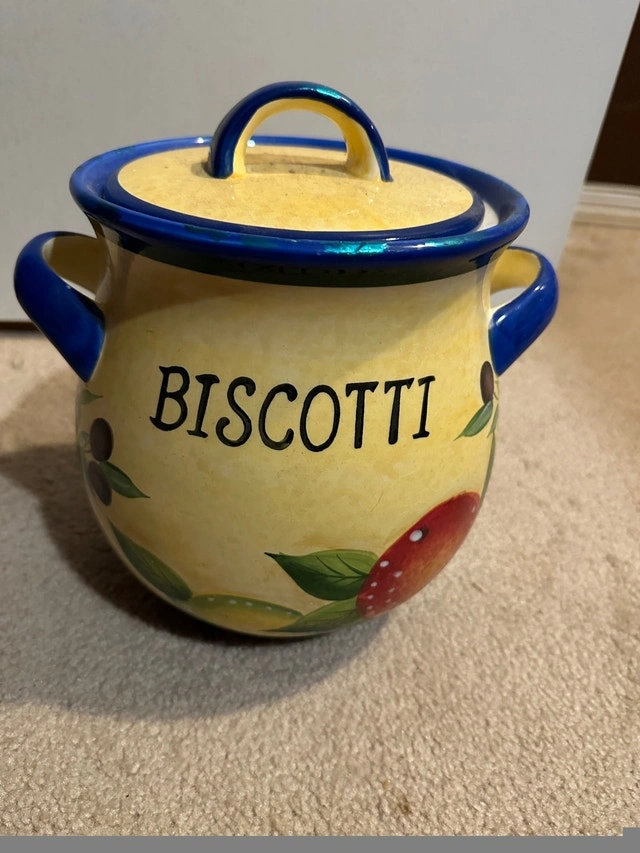 Decorative ceramic jar labeled “Biscotti”, perfect for storing cookies. Features colorful fruit or vegetable motifs with a blue-trimmed lid and handles. Great for both functional storage and kitchen decor. From a bug-free, smoke-free, pet-free home. Cash only, pick up in the South Pembina, Fort Richmond Area.