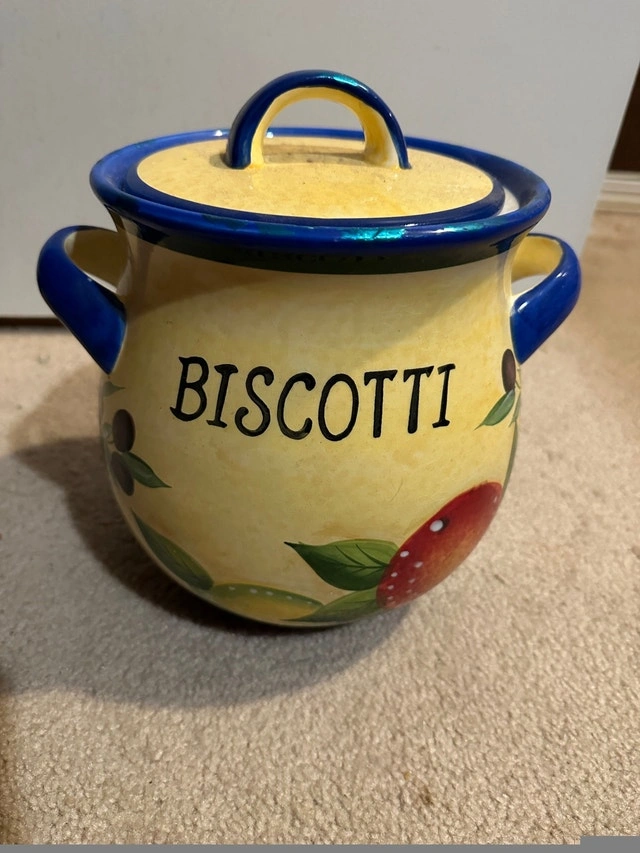 Decorative ceramic jar labeled “Biscotti”, perfect for storing cookies. Features colorful fruit or vegetable motifs with a blue-trimmed lid and handles. Great for both functional storage and kitchen decor. From a bug-free, smoke-free, pet-free home. Cash only, pick up in the South Pembina, Fort Richmond Area.
