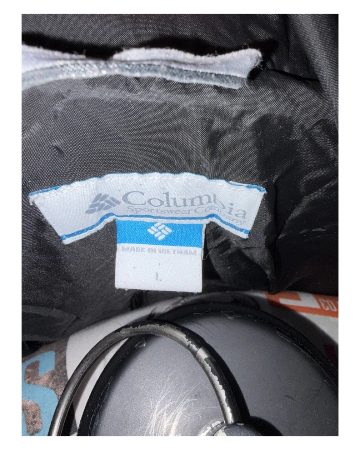 Columbia puffer jacket in black. It's a size large. Made in Vietnam. This jacket is perfect for keeping warm on chilly days!