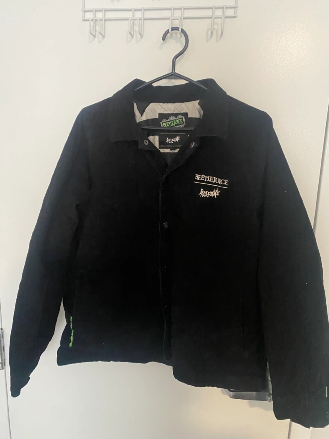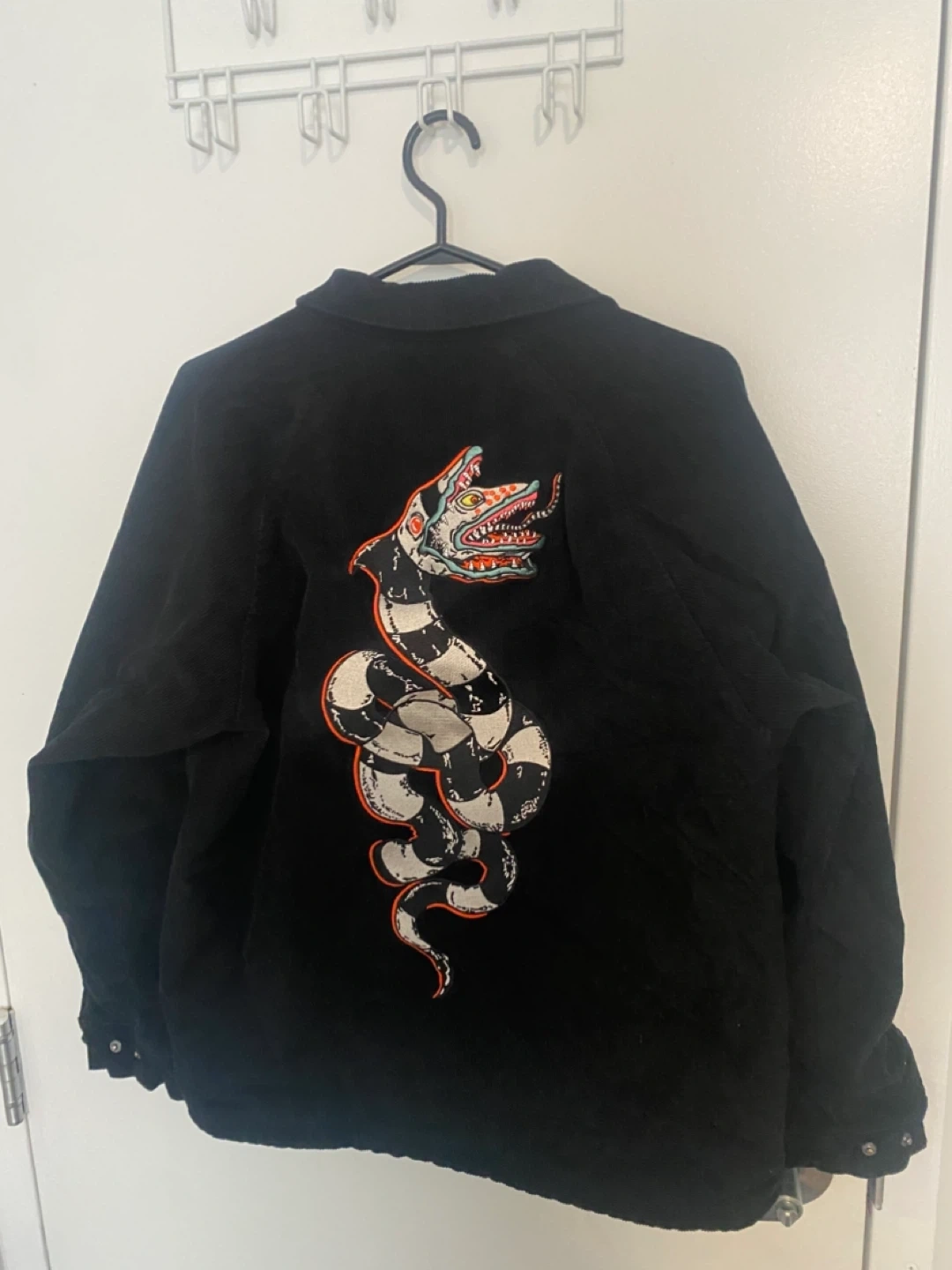 Black corduroy jacket with a large embroidered snake graphic on the back. Features a quilted striped interior lining. It's a cool piece for any Beetlejuice fan!