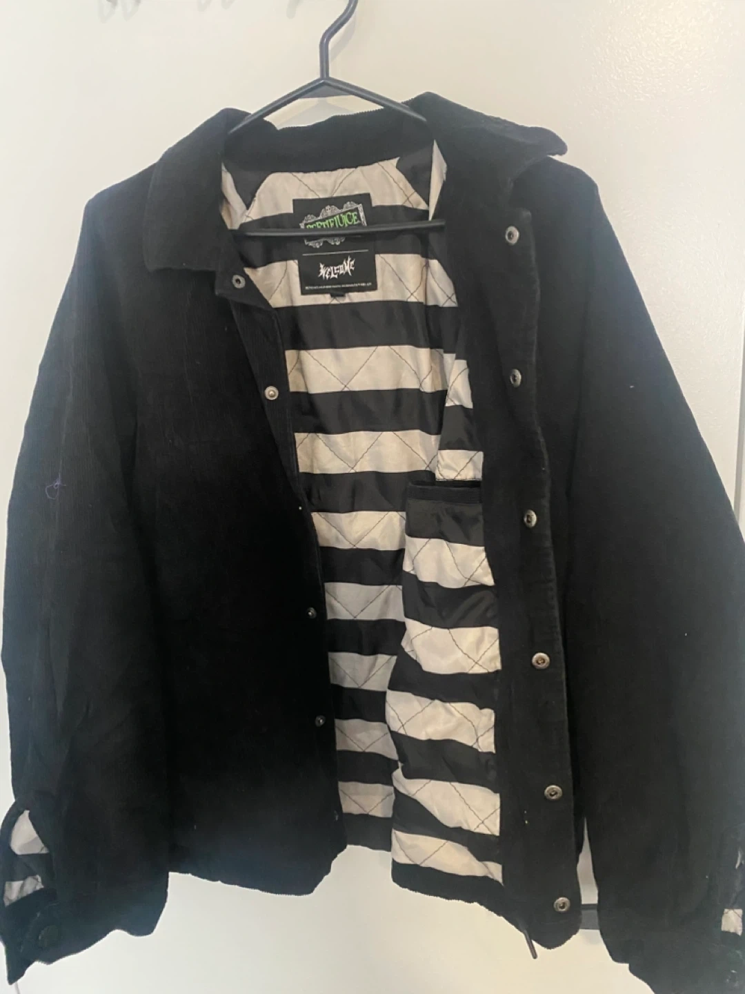 Black corduroy jacket with a large embroidered snake graphic on the back. Features a quilted striped interior lining. It's a cool piece for any Beetlejuice fan!