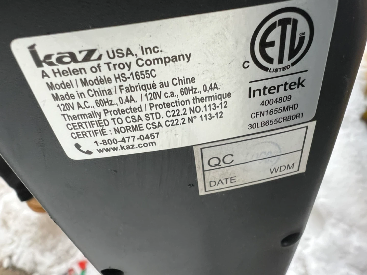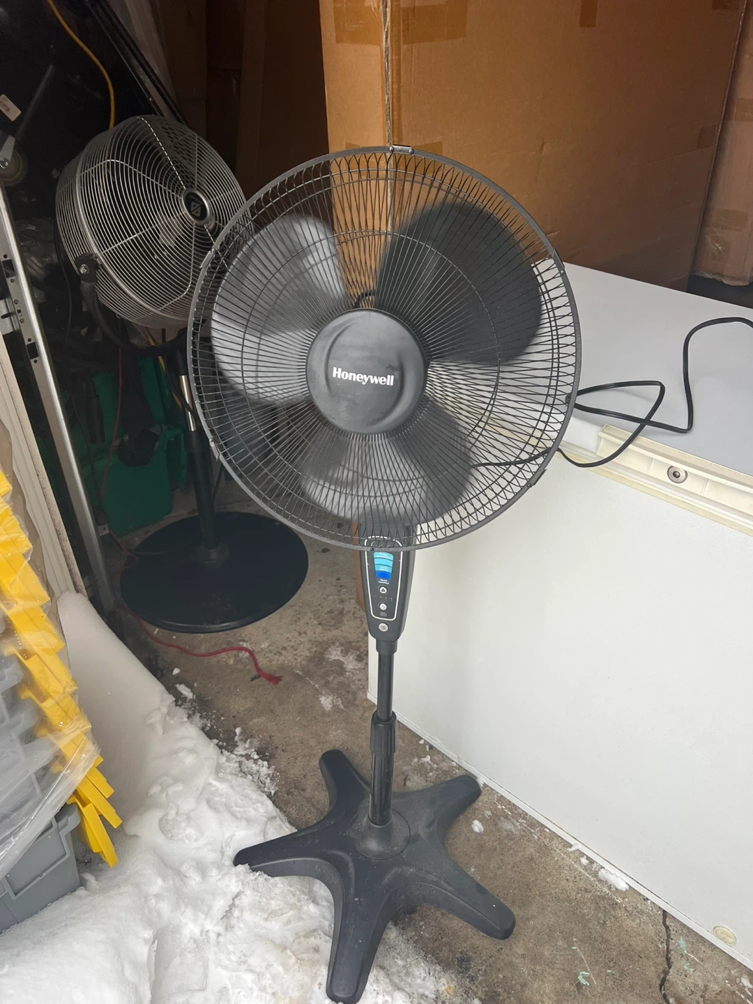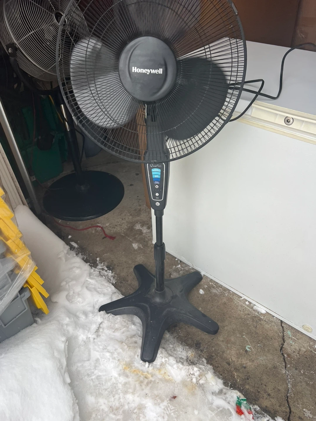 Used Honeywell QuietSet pedestal fan. Features multiple speed settings including Power Alimentation, Quiet Silence, and Sleep. Has an adjustable height and oscillation function. Great for circulating air in any room!