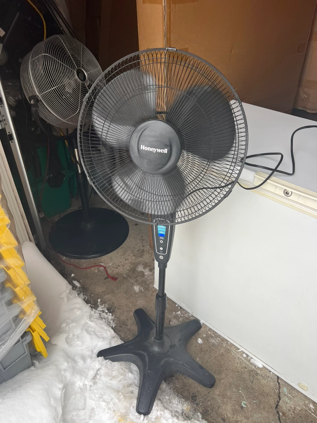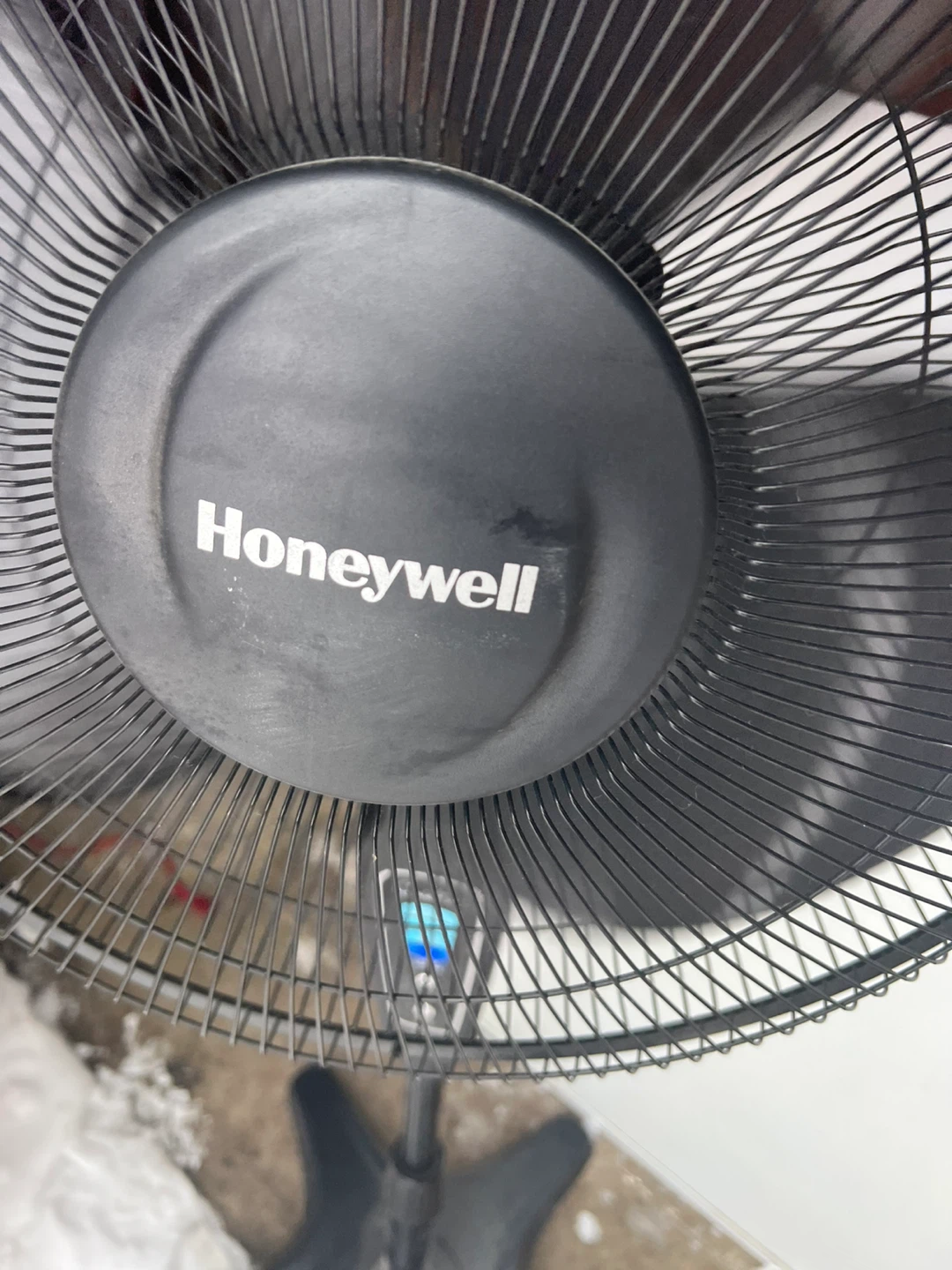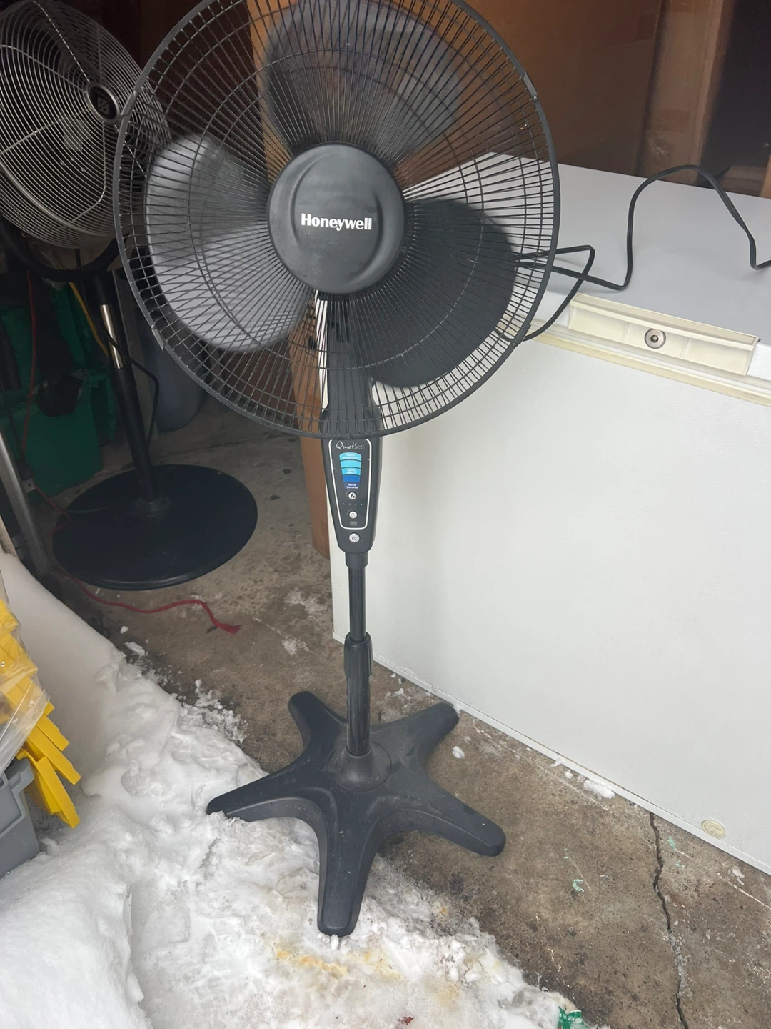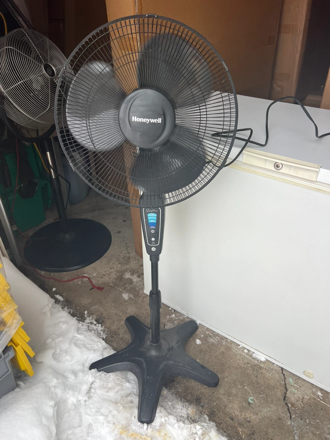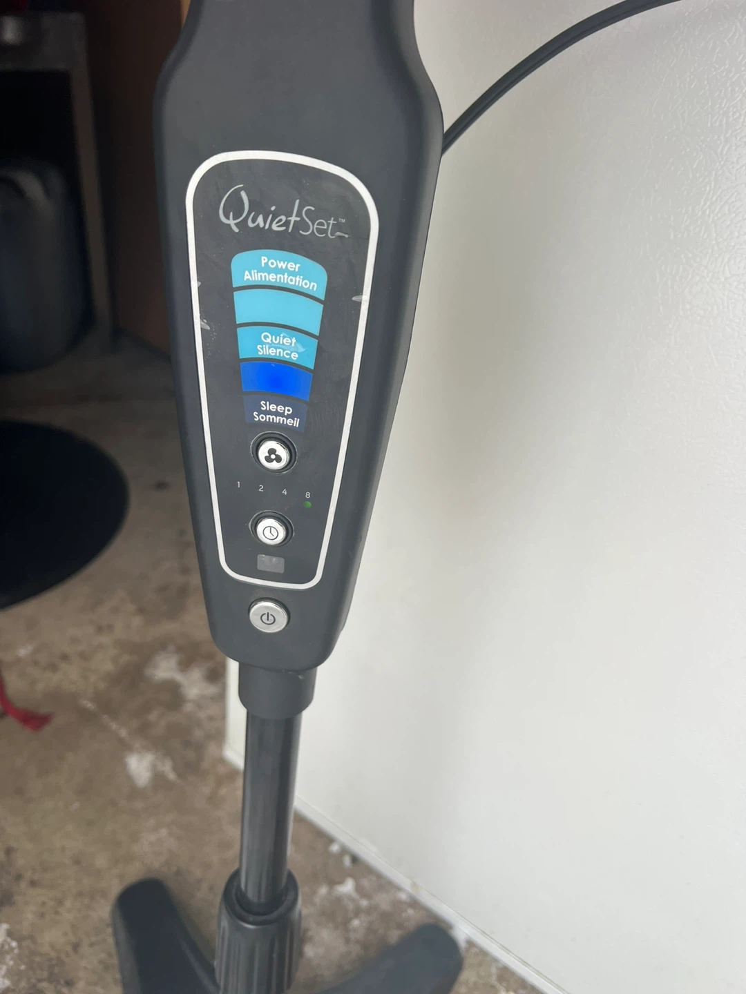 Used Honeywell QuietSet pedestal fan. Features multiple speed settings including Power Alimentation, Quiet Silence, and Sleep. Has an adjustable height and oscillation function. Great for circulating air in any room!