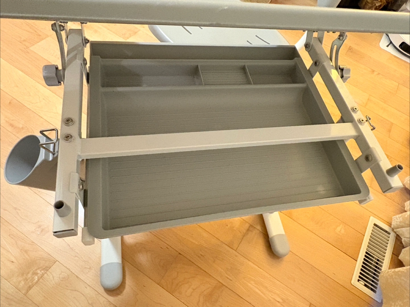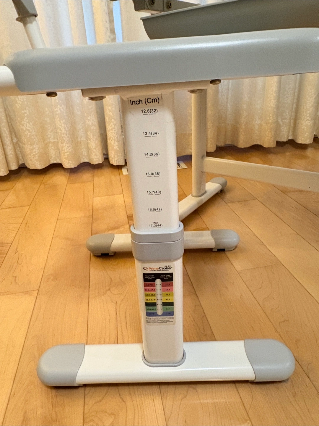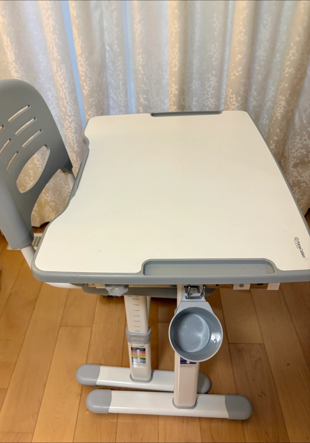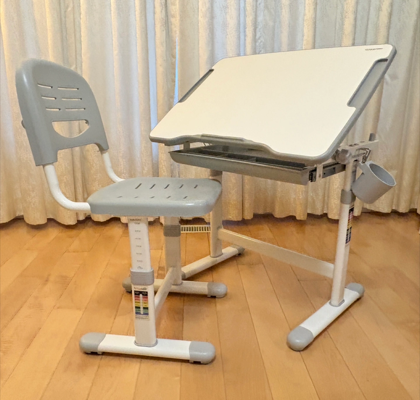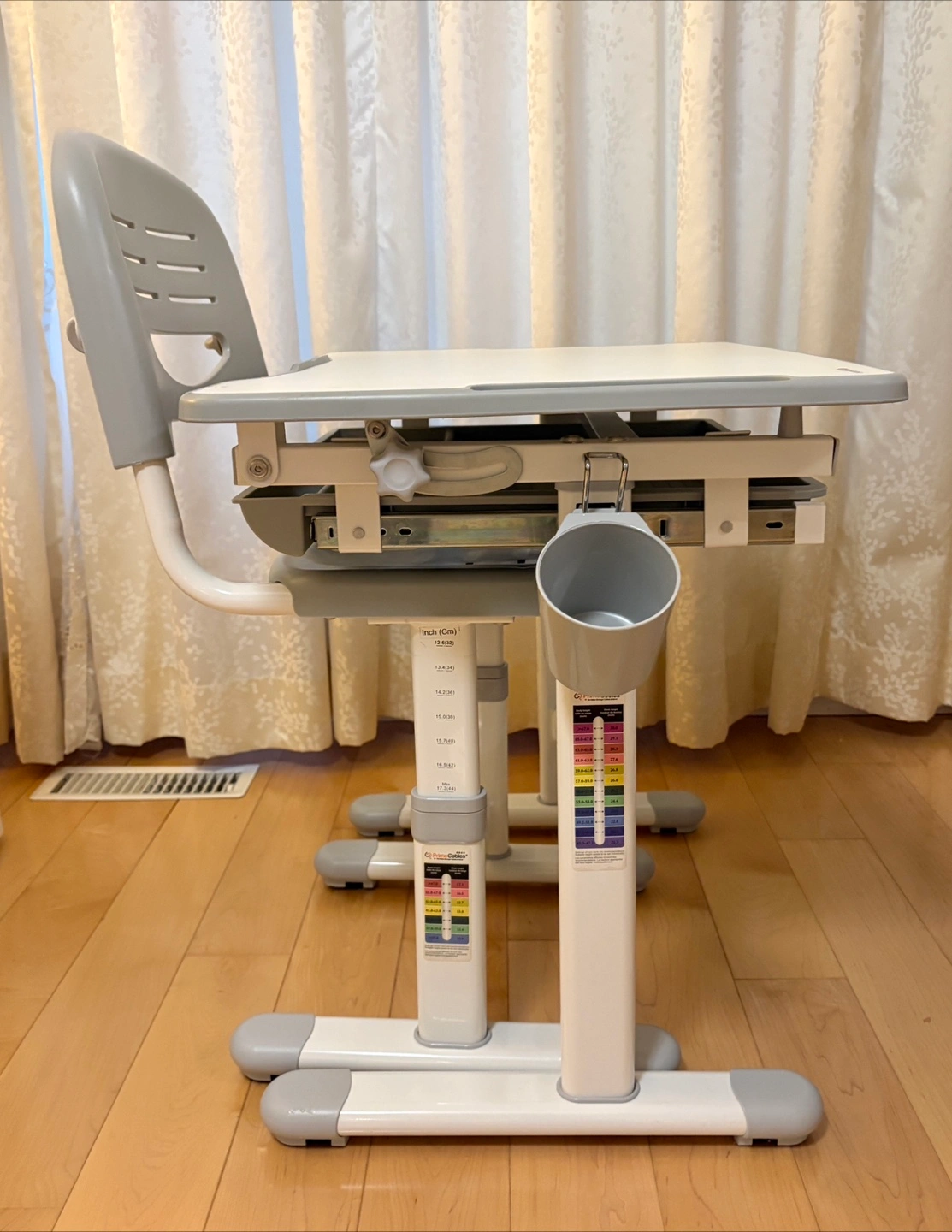 Kids adjustable height desk and chair. Grey and white colours. Features a pull-out drawer and pencil holder. Height adjustable. Good condition. Retails for $170.