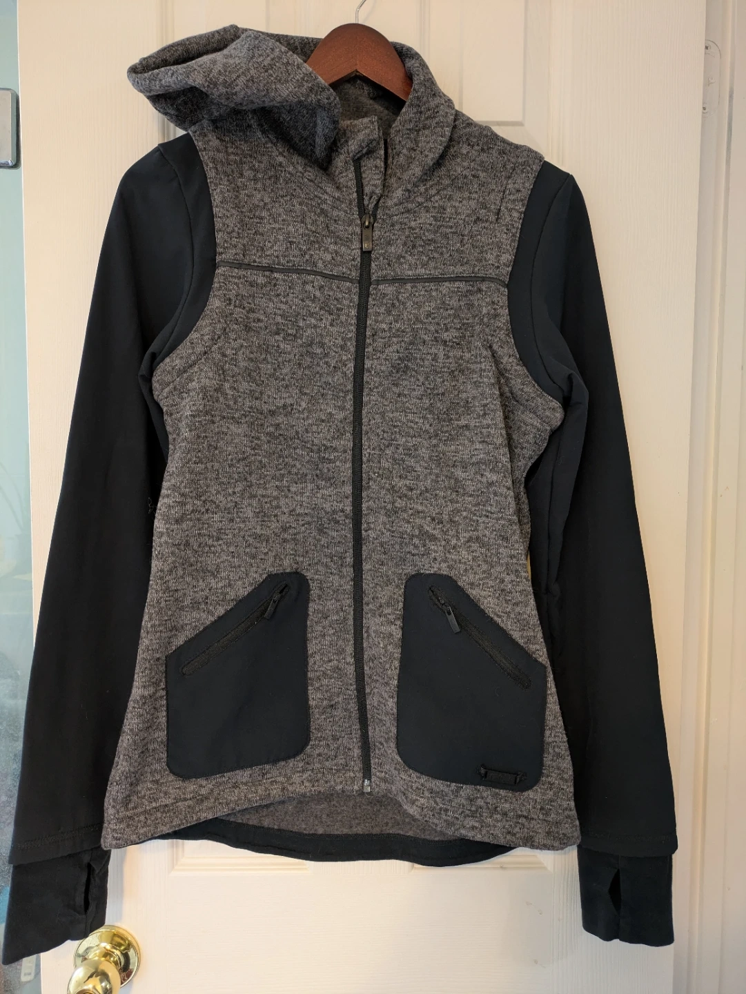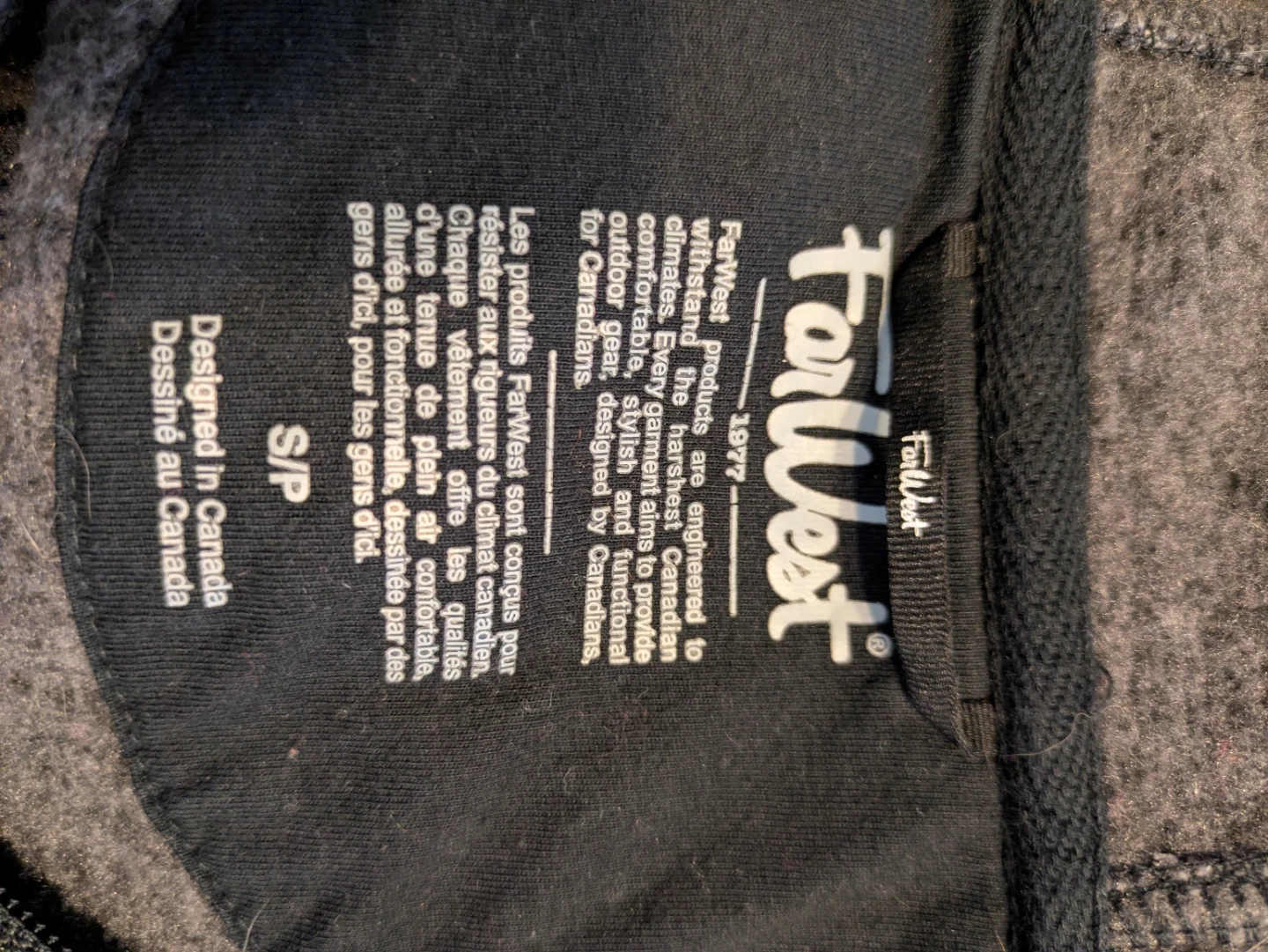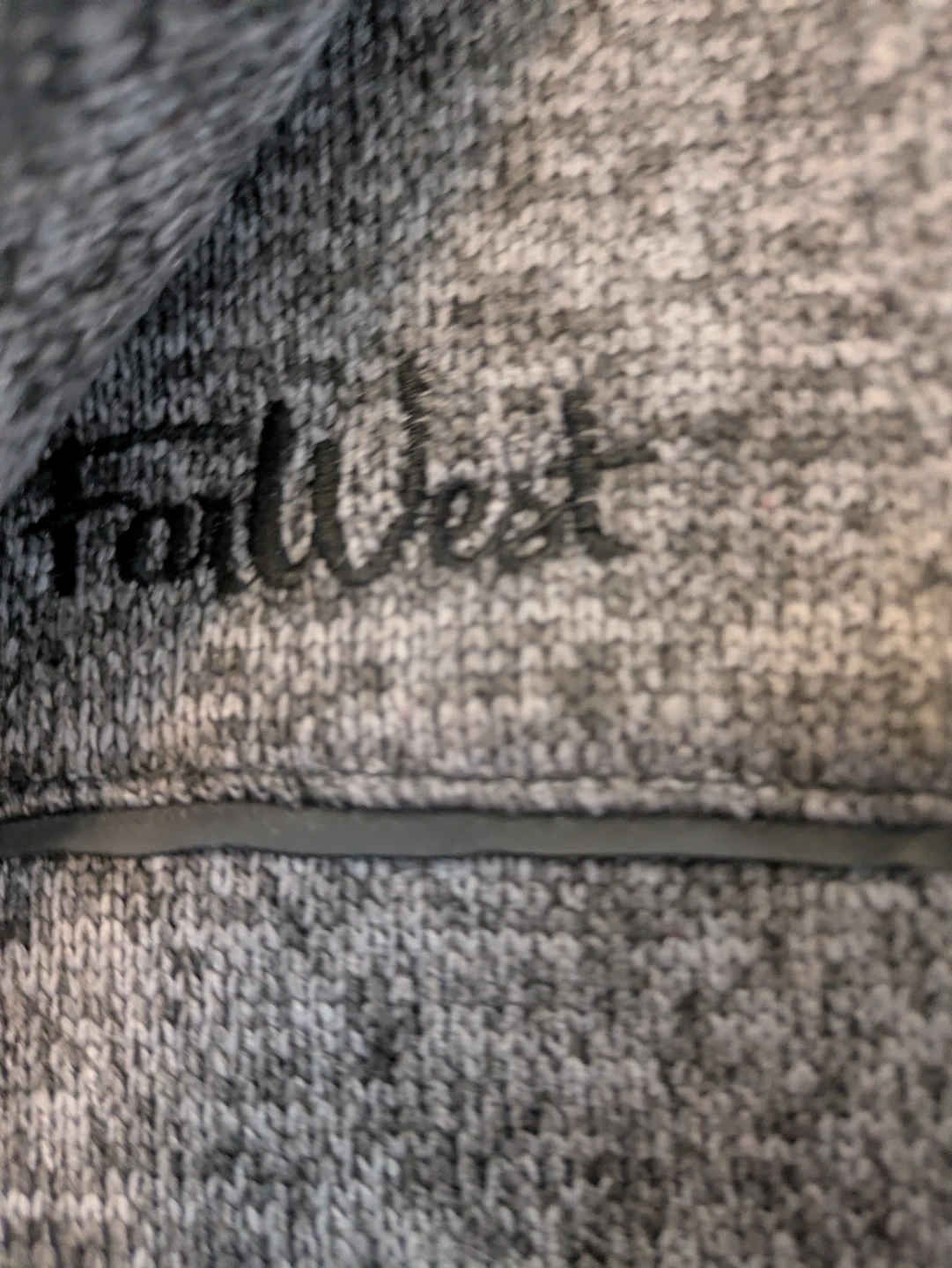 FarWest women's full-zip hoodie jacket, designed and made in Canada. It's grey heathered fleece with black sleeves and accents. Features include thumbholes and zippered pockets. Size S -M.