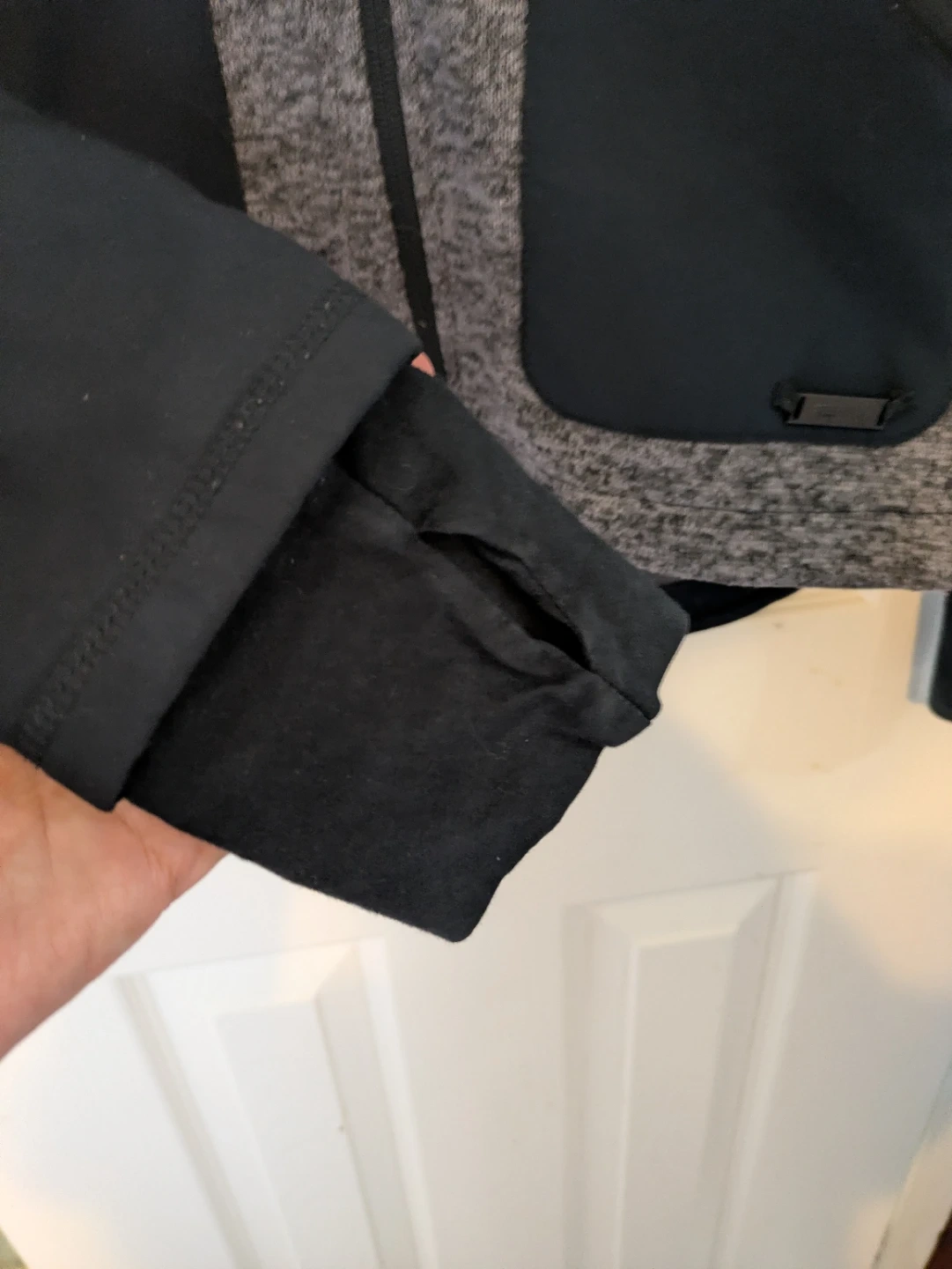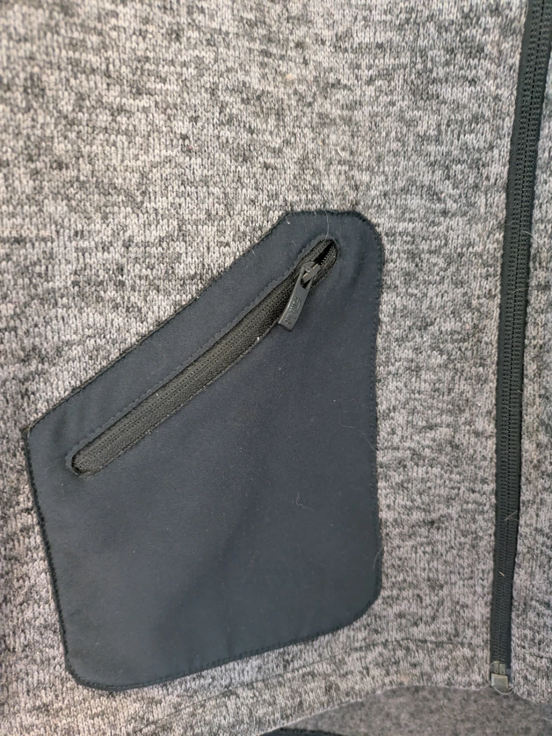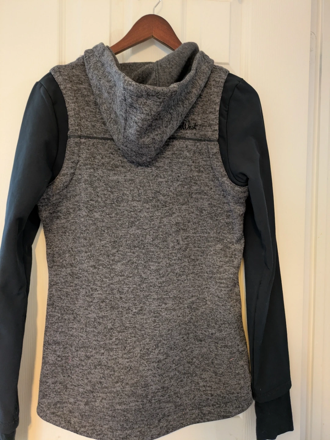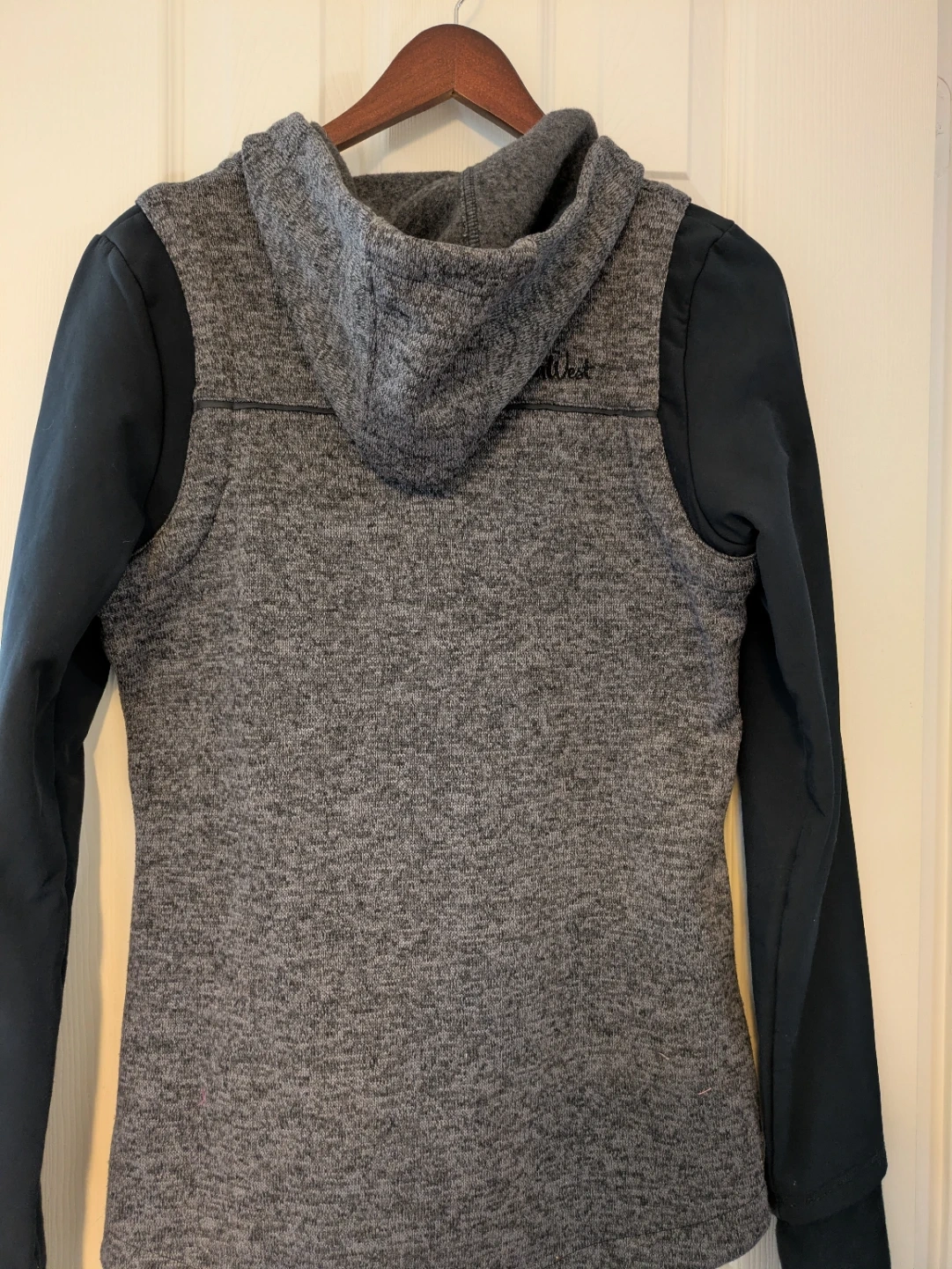 FarWest women's full-zip hoodie jacket, designed and made in Canada. It's grey heathered fleece with black sleeves and accents. Features include thumbholes and zippered pockets. Size S -M.
