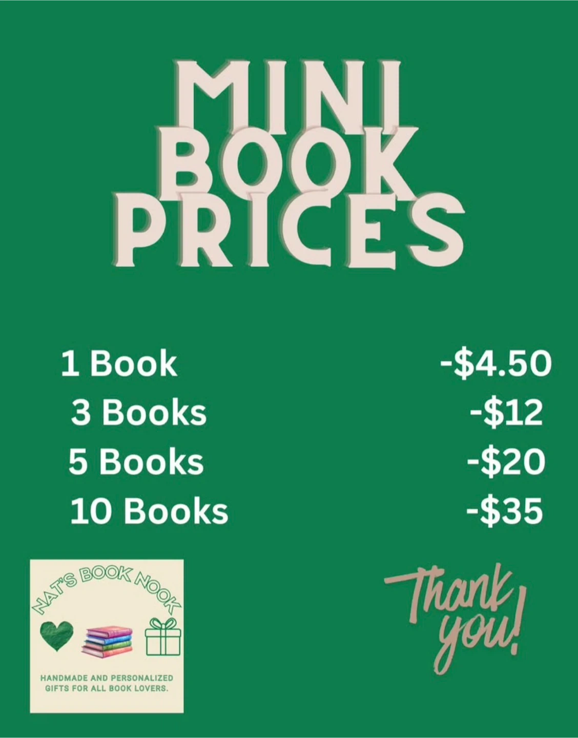 Browse a selection of mini books from various authors and genres. Prices start at $4.50 for one book, with discounts for multiple purchases. Many other titles are available, perfect for any book lover.