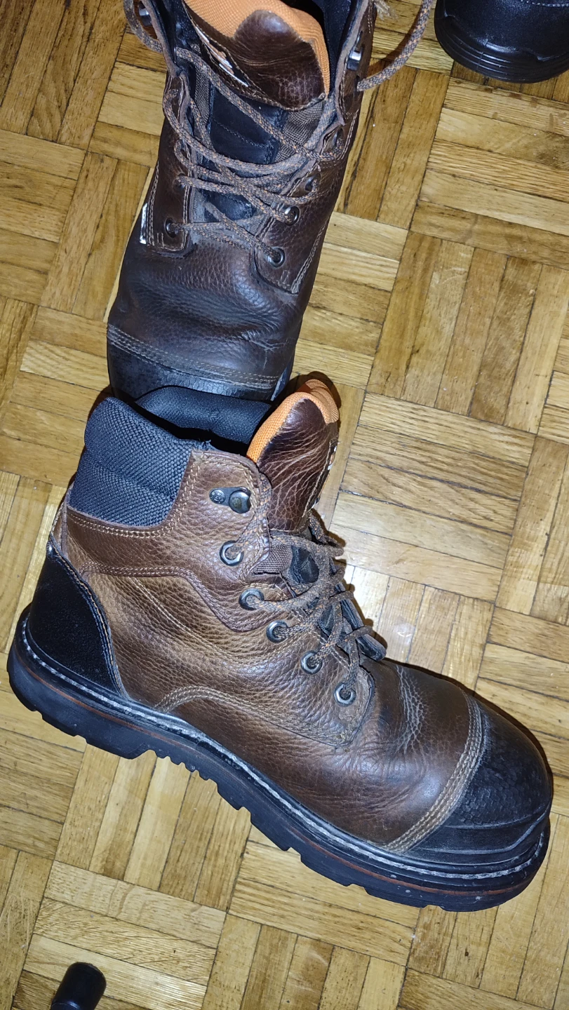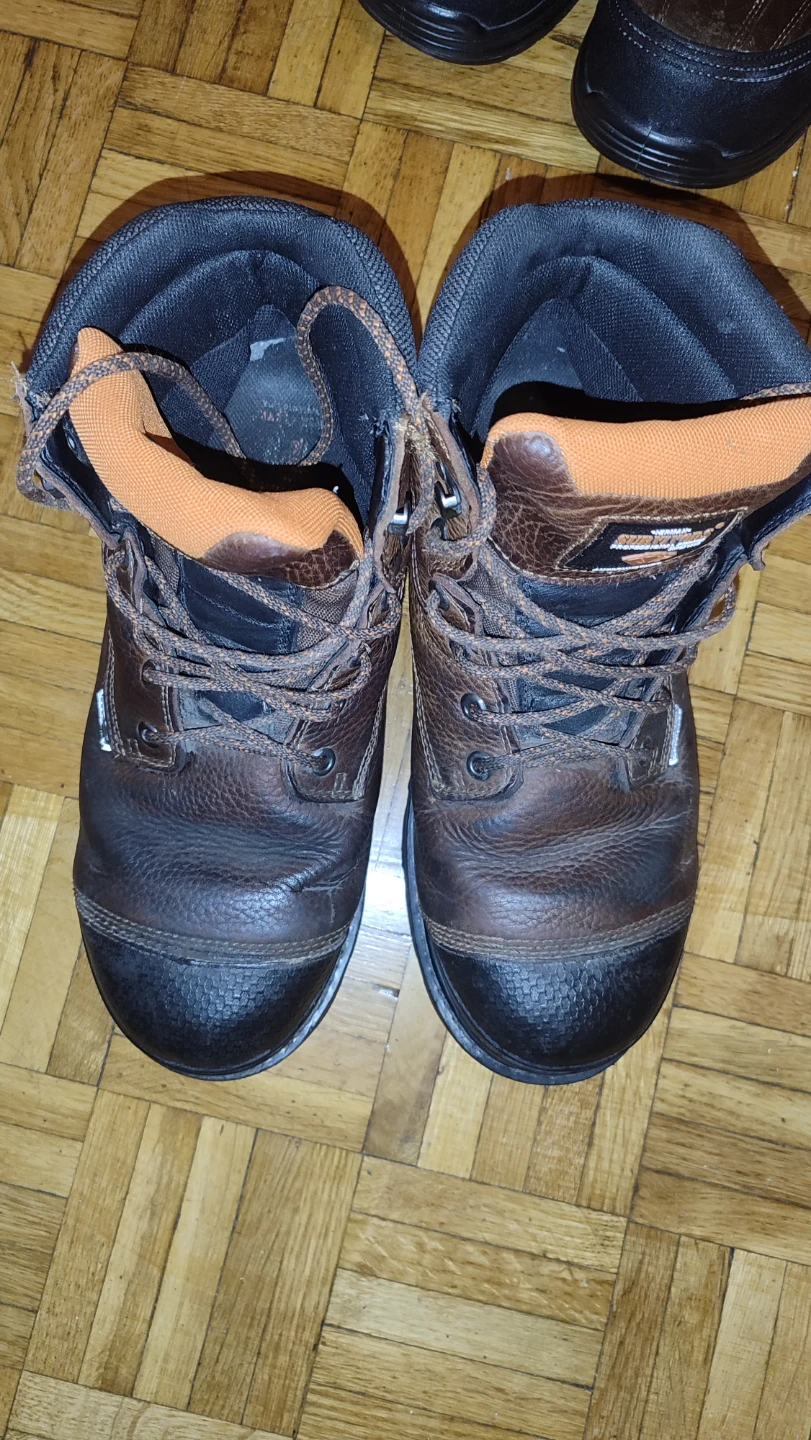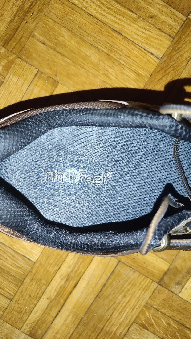 These OrthoFeet shoes feature a brown leather upper with a wide fit. They're a size 11. Safety rated ASTM F2413-18 M/I/C EH