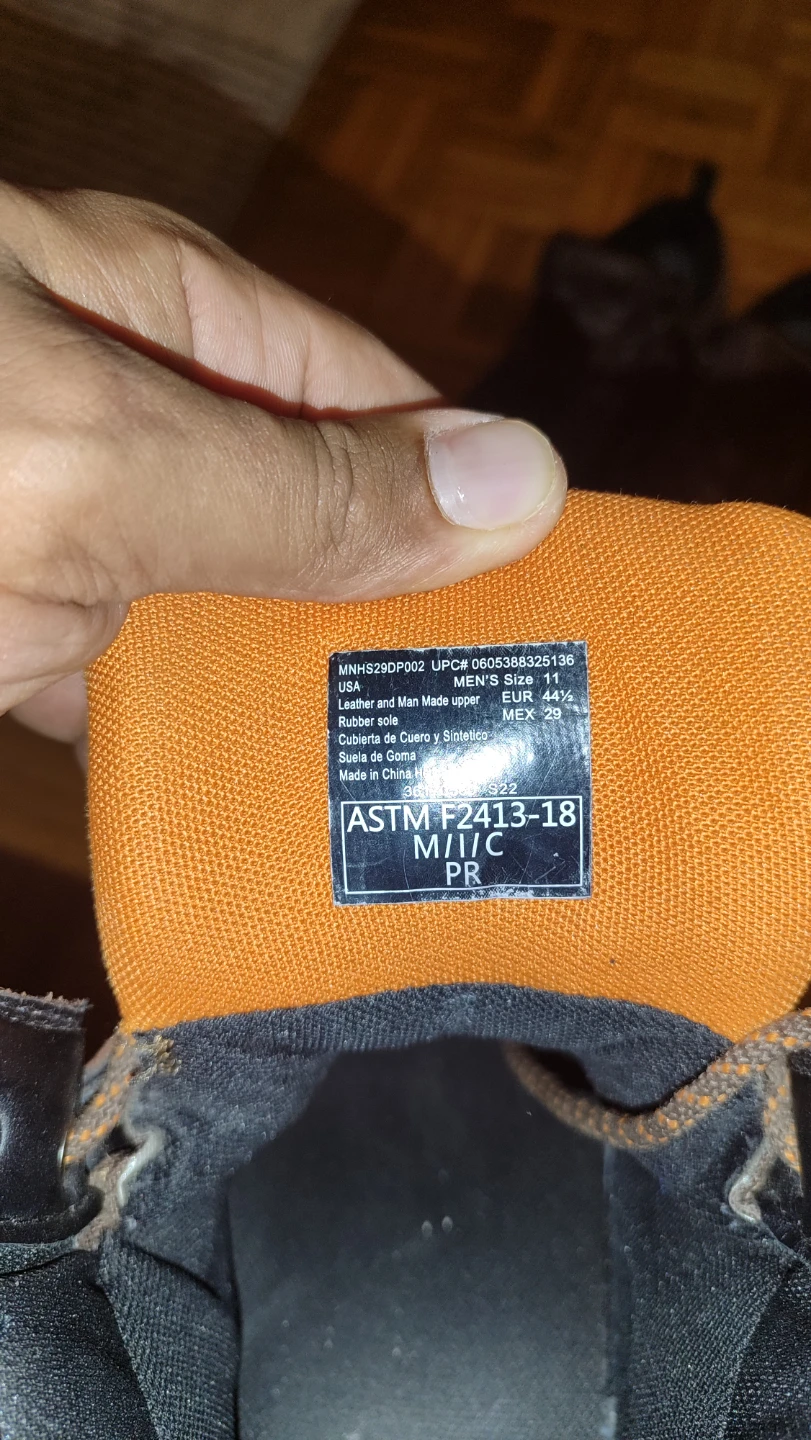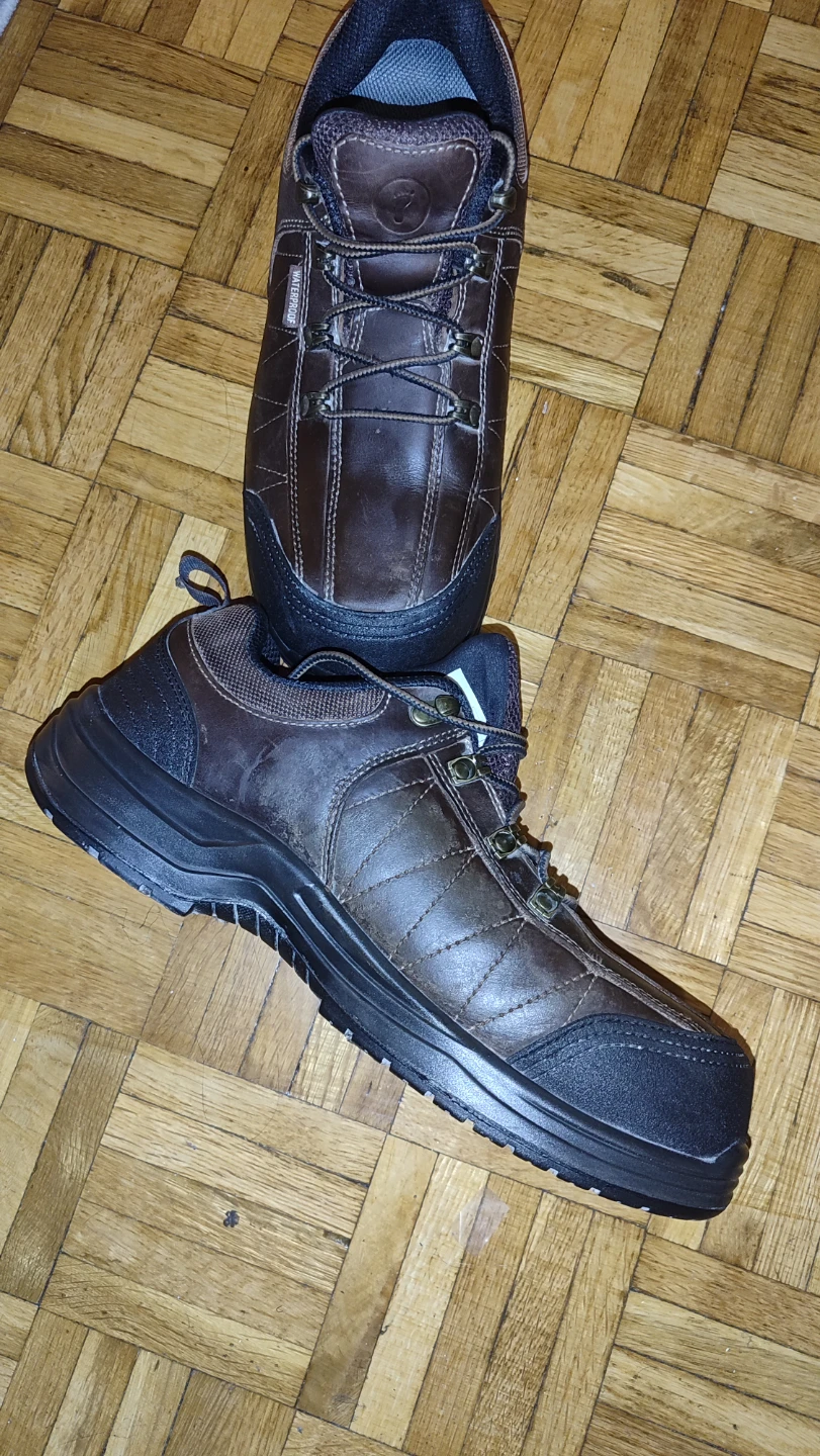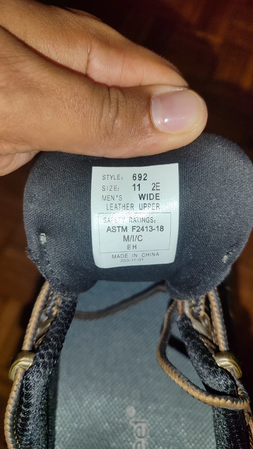 These OrthoFeet shoes feature a brown leather upper with a wide fit. They're a size 11. Safety rated ASTM F2413-18 M/I/C EH