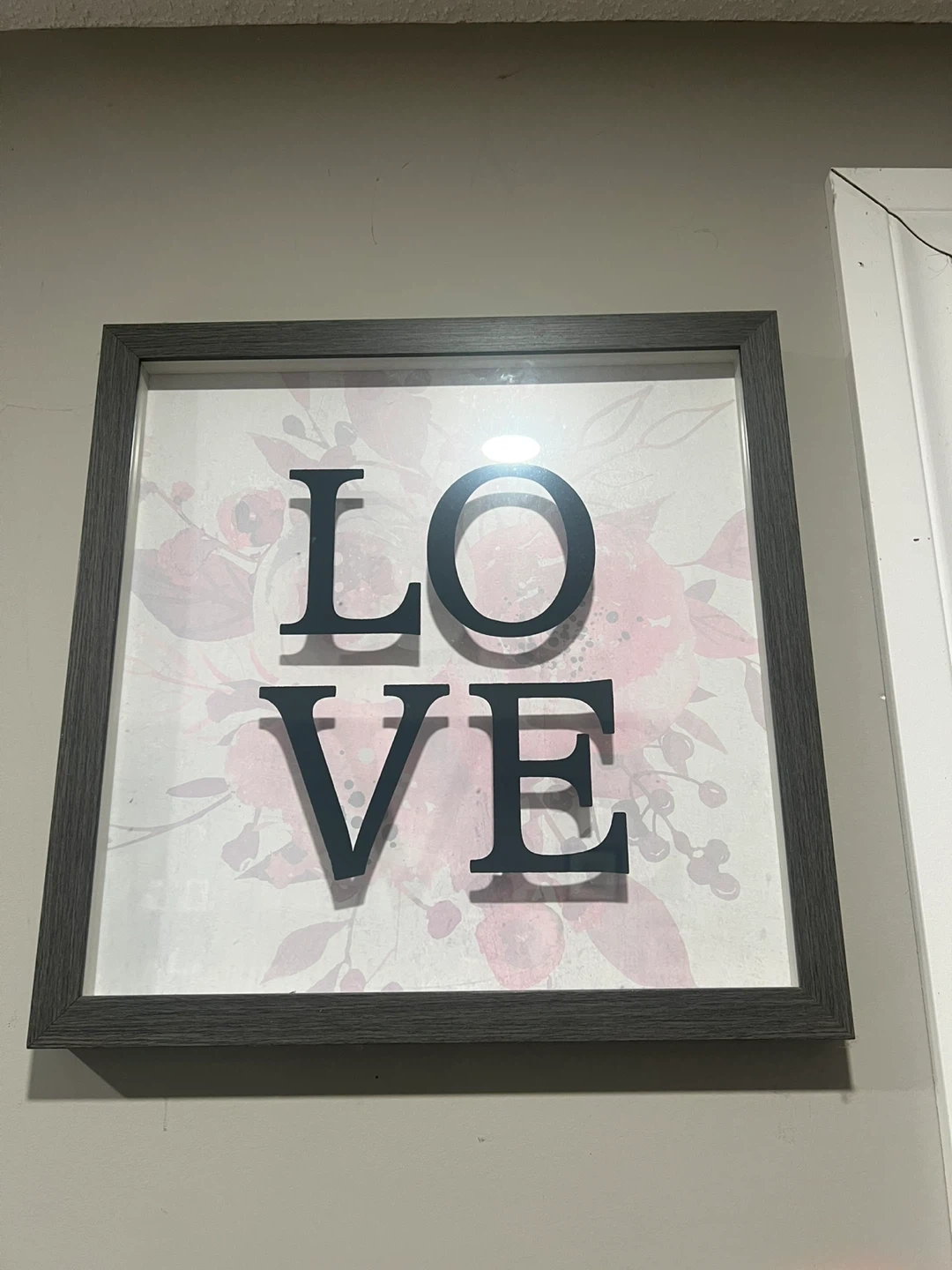 This framed wall art spells out 'LOVE' with large, bold letters against a soft floral background. It's a lovely piece to add warmth to any room. The frame is a dark grey wood-look material. Dimensions: 16x16 inches.