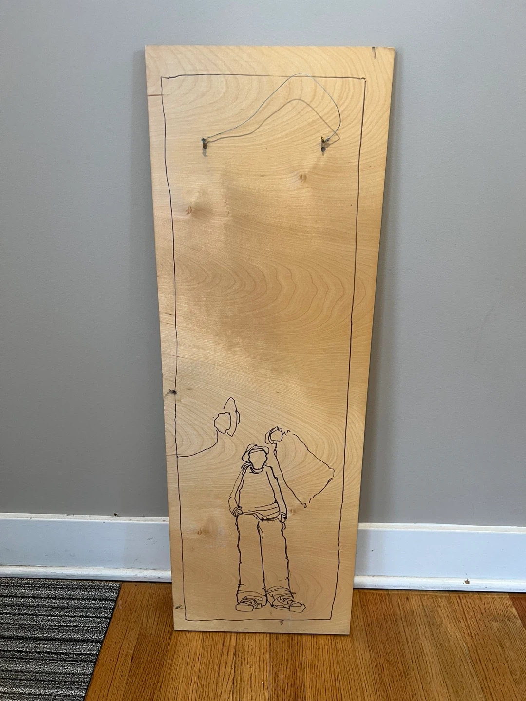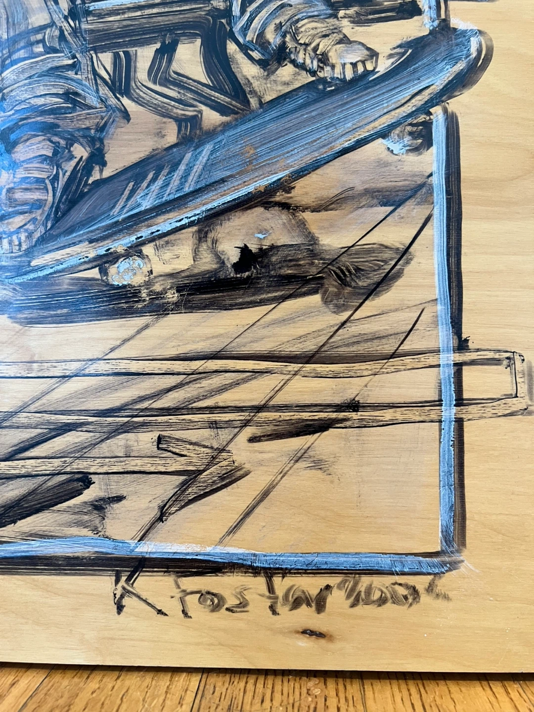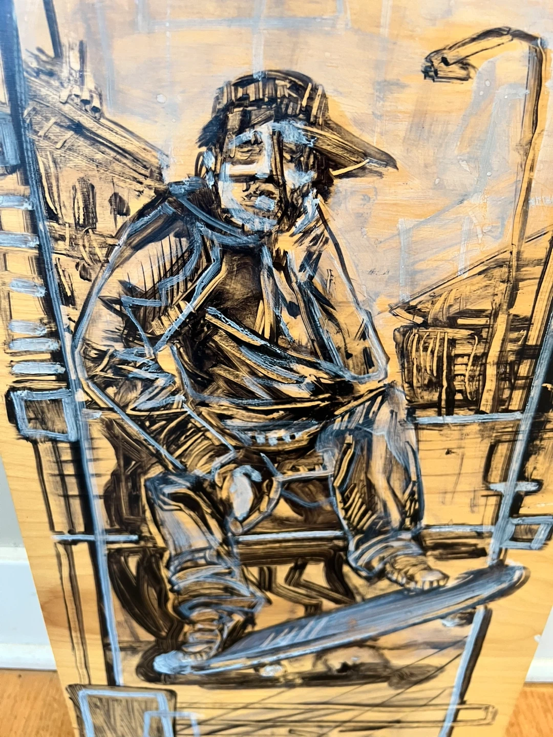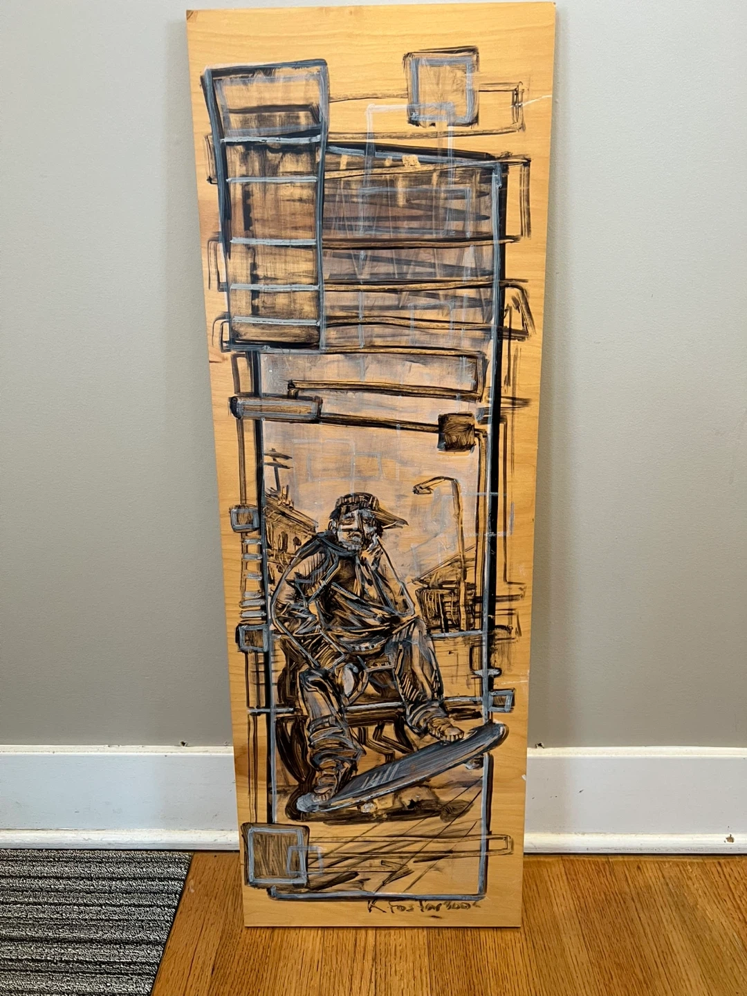 This is a unique piece of artwork on a wood panel. It features a sketch-style drawing of a person with a skateboard. The artwork is in black and grey tones. It's a great conversation starter for your home!