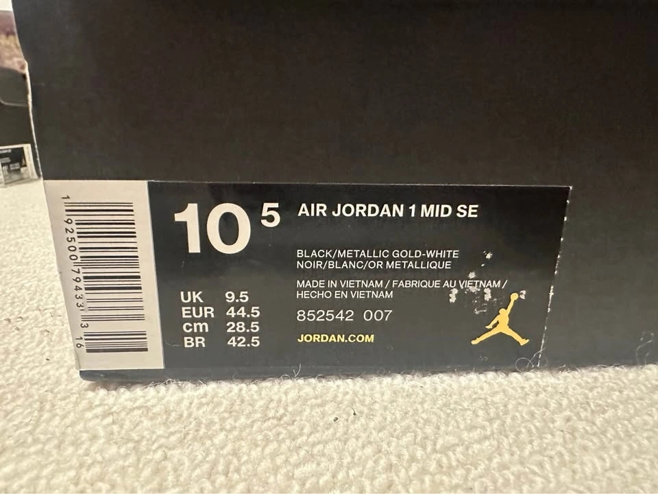 Fresh Air Jordan 1 Mid SE kicks. Black, metallic gold, and white colorway. Men's size 10.5. Comes with original box. These are in amazing shape.