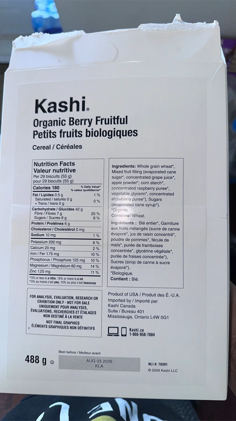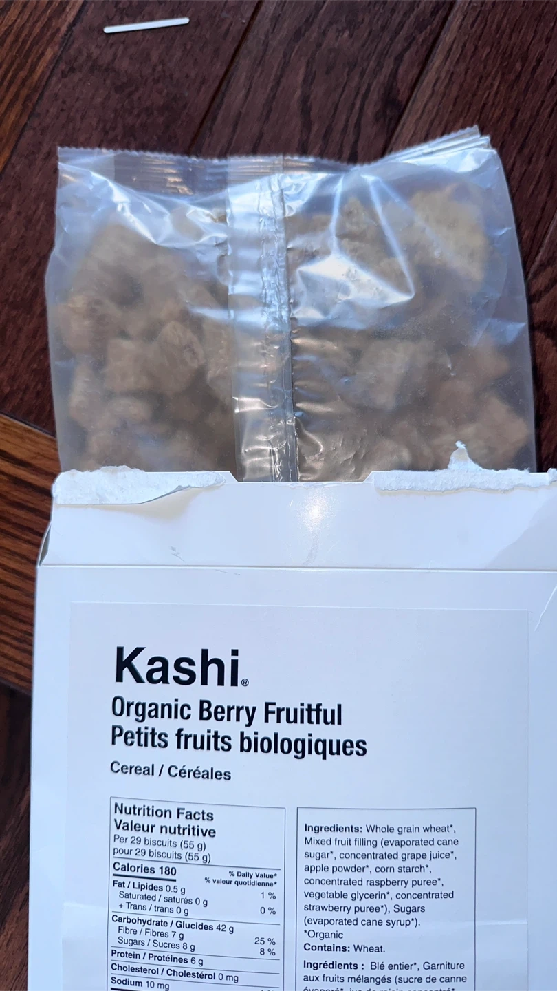 Kashi Organic Berry Fruitful cereal. Contains whole grain wheat and a mixed fruit filling.