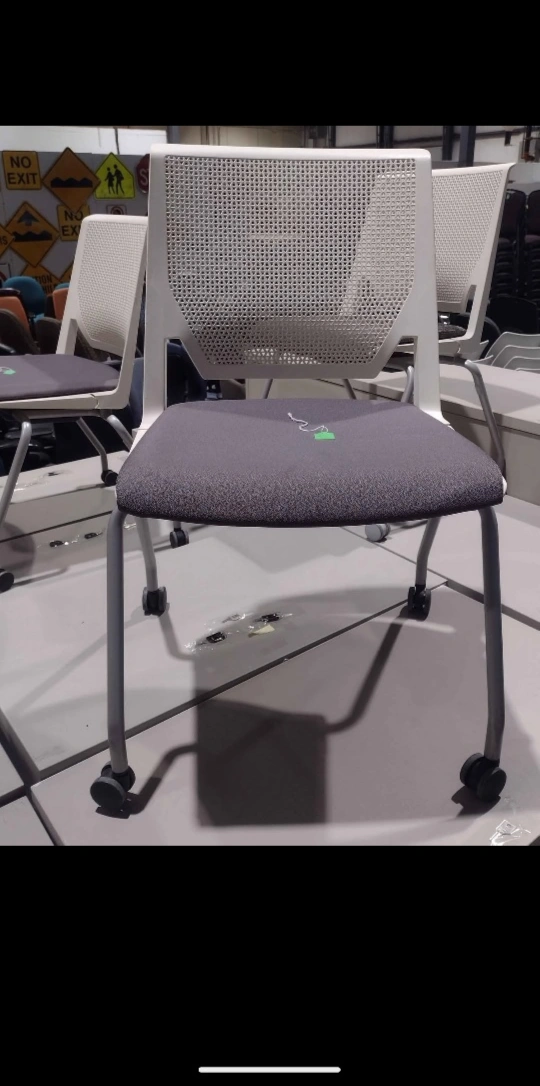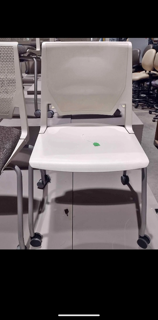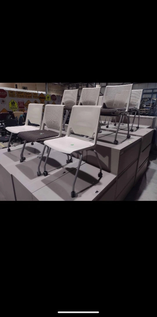 In very good condition, with casters for easy mobility. Stackable design for convenient storage. Suitable for office, classroom, or waiting area. 5 white plastic mesh back chairs with brown flecked fabric seats, 2 white plastic chairs, and 2 white plastic mesh back chairs with grey seats. $65 each plus HST. Pick up near Gage and Belmont in Kitchener Monday-Friday from 12-5 p.m. By appointment. Quantity - 9 Check out my other ads!