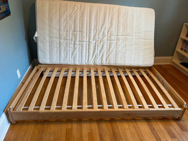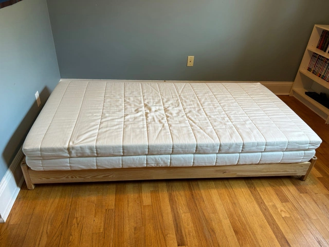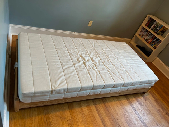 IKEA UTAKER twin stackable pine bed frames. Used for a kid's bedroom, super handy for sleepovers -- unstack to have 2 separate twin beds. Comes with 2 foam mattresses. We also have 1 conventional twin mattress if that style is preferred. Will sell all together or separately as 2 twin beds. See this IKEA photo for how they stack: https://www.ikea.com/ca/en/p/utaker-stackable-bed-pine-30360487 $125 for the lot. Smoke free home.