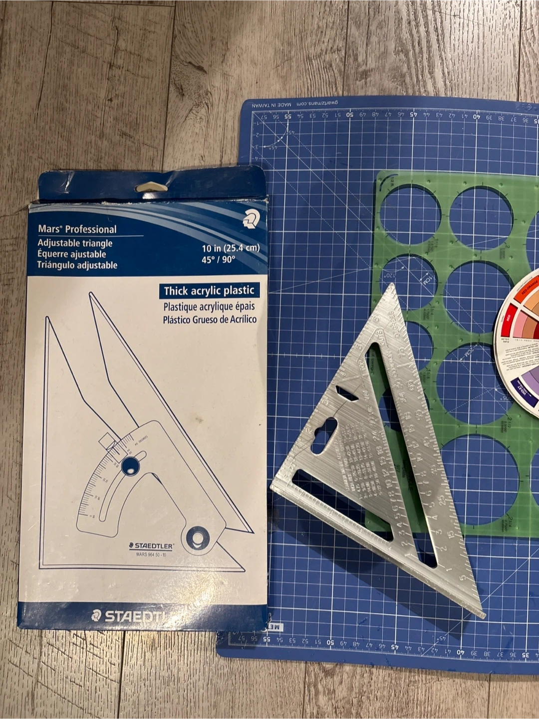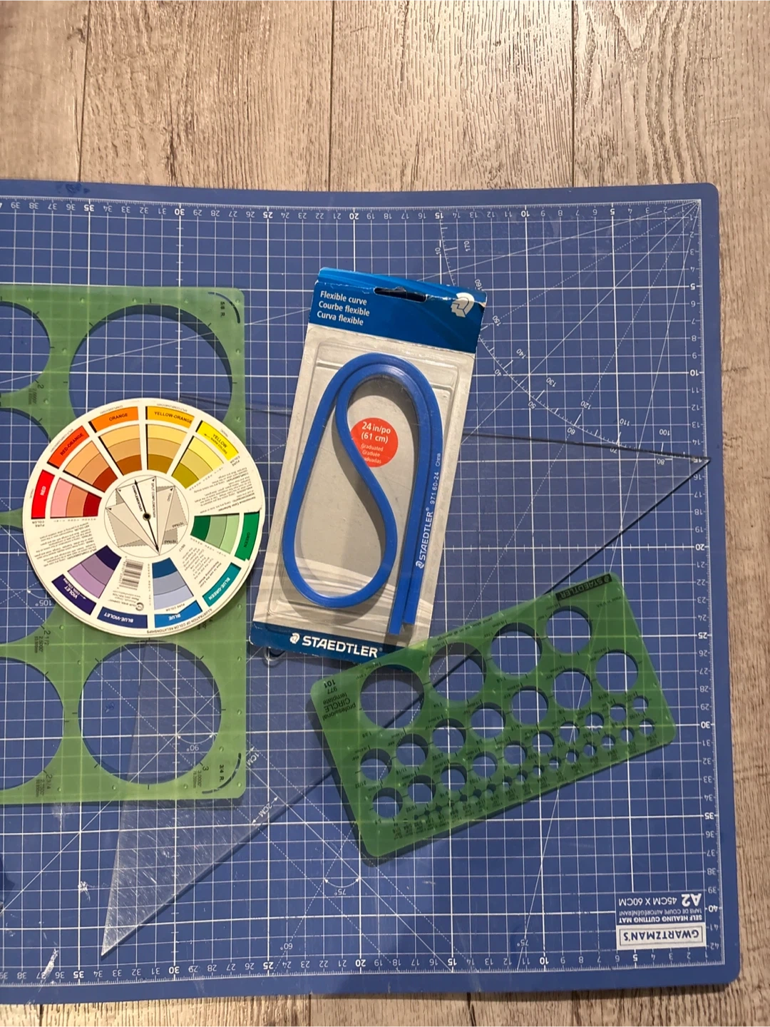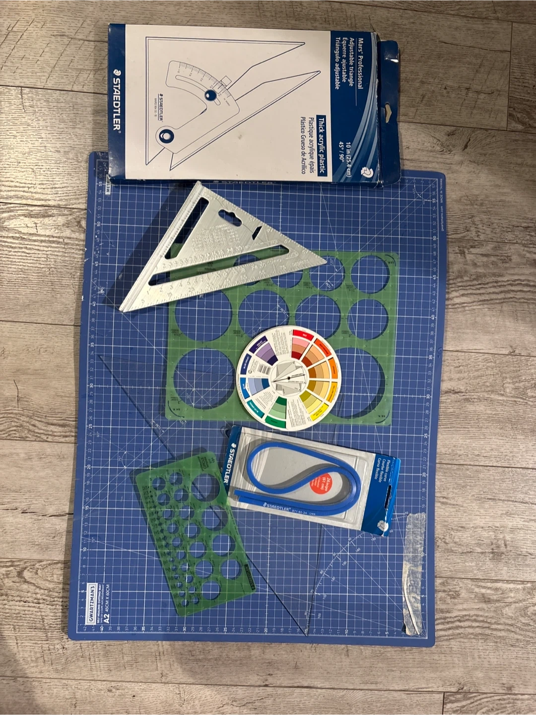 215Selling a set of Staedtler drafting tools! Includes a Mars' Professional adjustable triangle, a flexible curve, circle templates, and a cutting mat. Perfect for anyone into drafting or design. Selling everything as one set including cutting Matt