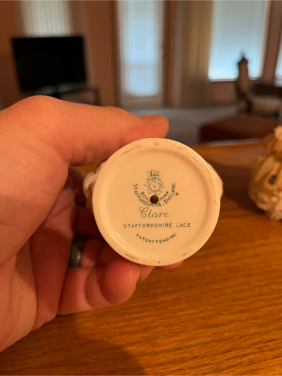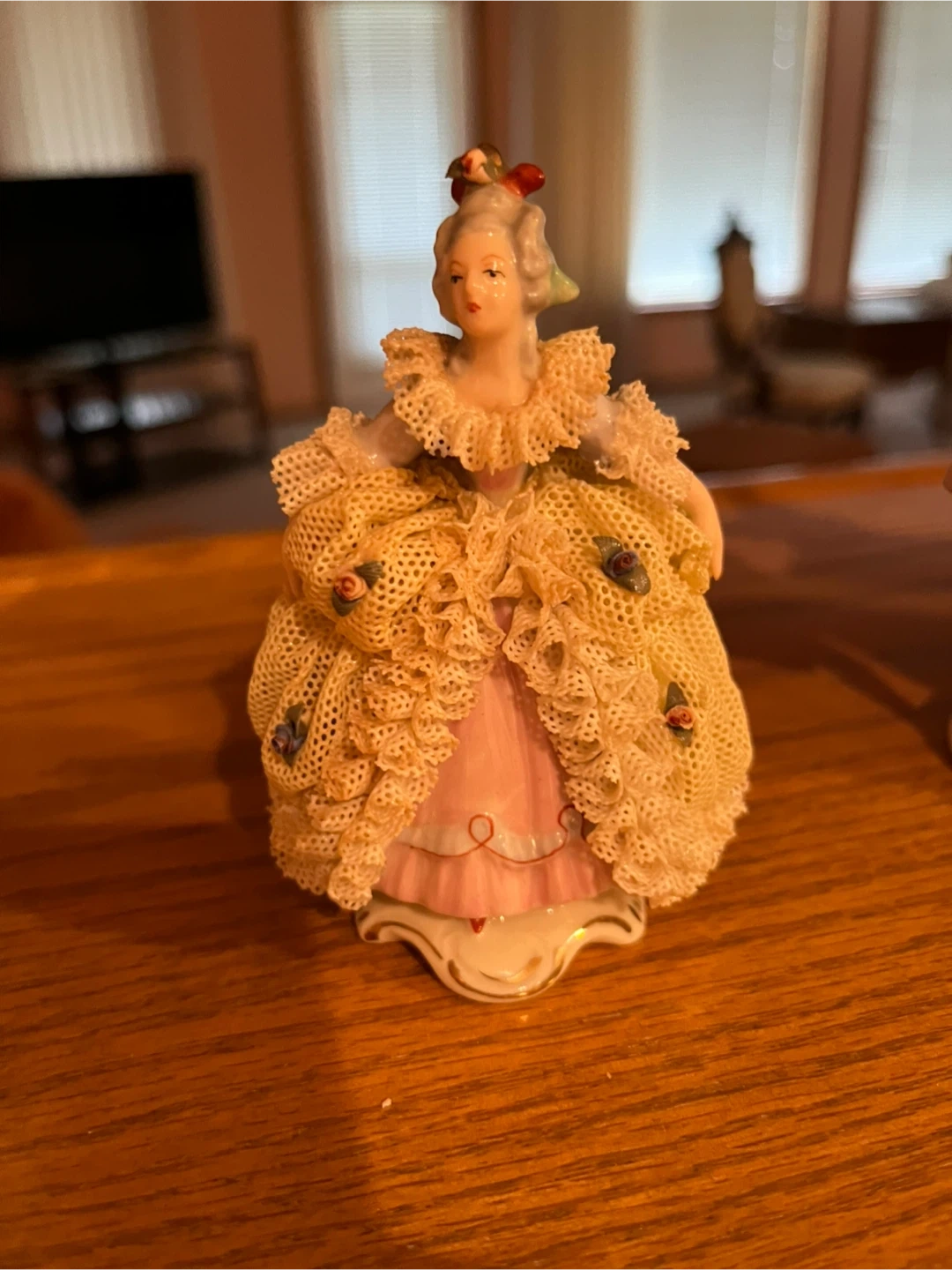 60Logan Estate Sale Cochrane Selling a charming Staffordshire Lace Clare figurine! This delicate piece features intricate lace detailing and a classic design. It's a lovely addition to any collection or a sweet decorative item for your home