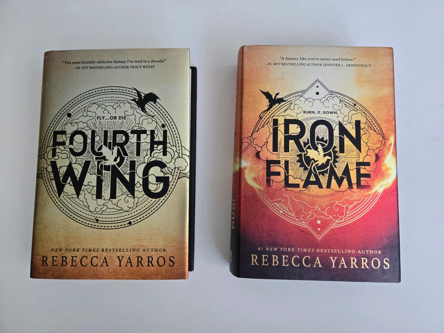 Two fantasy novels, Fourth Wing and Iron Flame, by Rebecca Yarros. Both are New York Times bestselling authors. These books are captivating reads for fantasy fans!