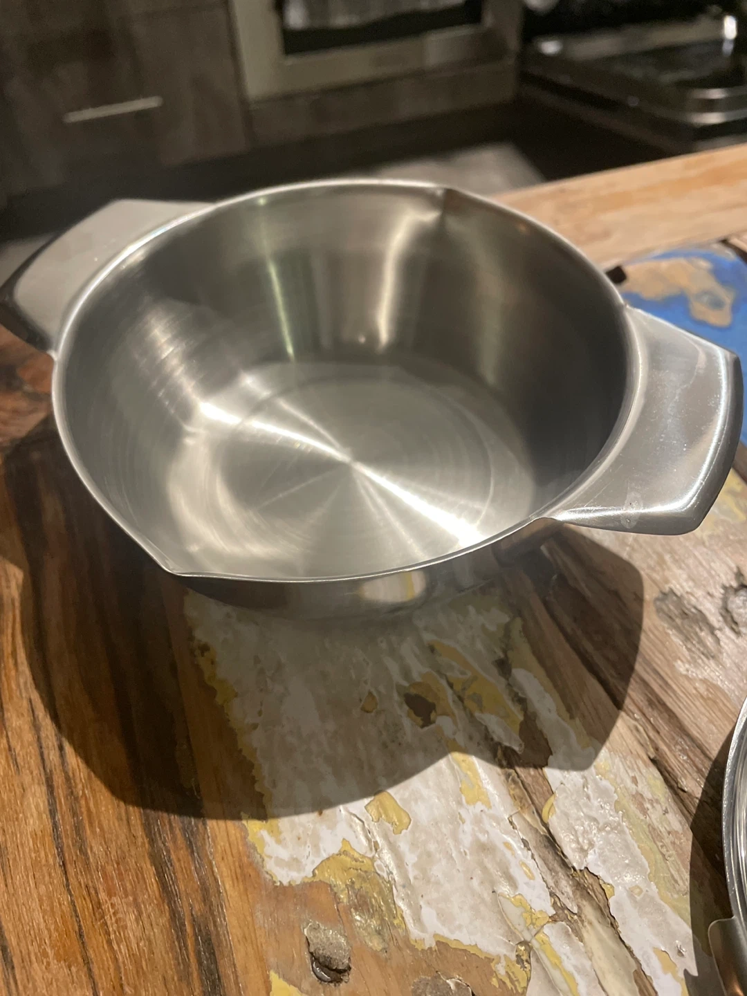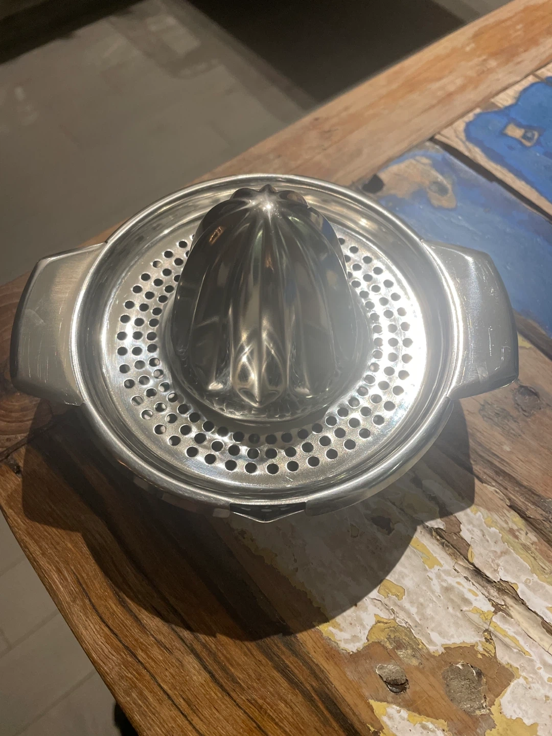 Here's a stainless steel citrus juicer, perfect for making fresh juice at home! It's in great condition and ready to use. It has a built-in bowl to catch the juice and handles for easy pouring