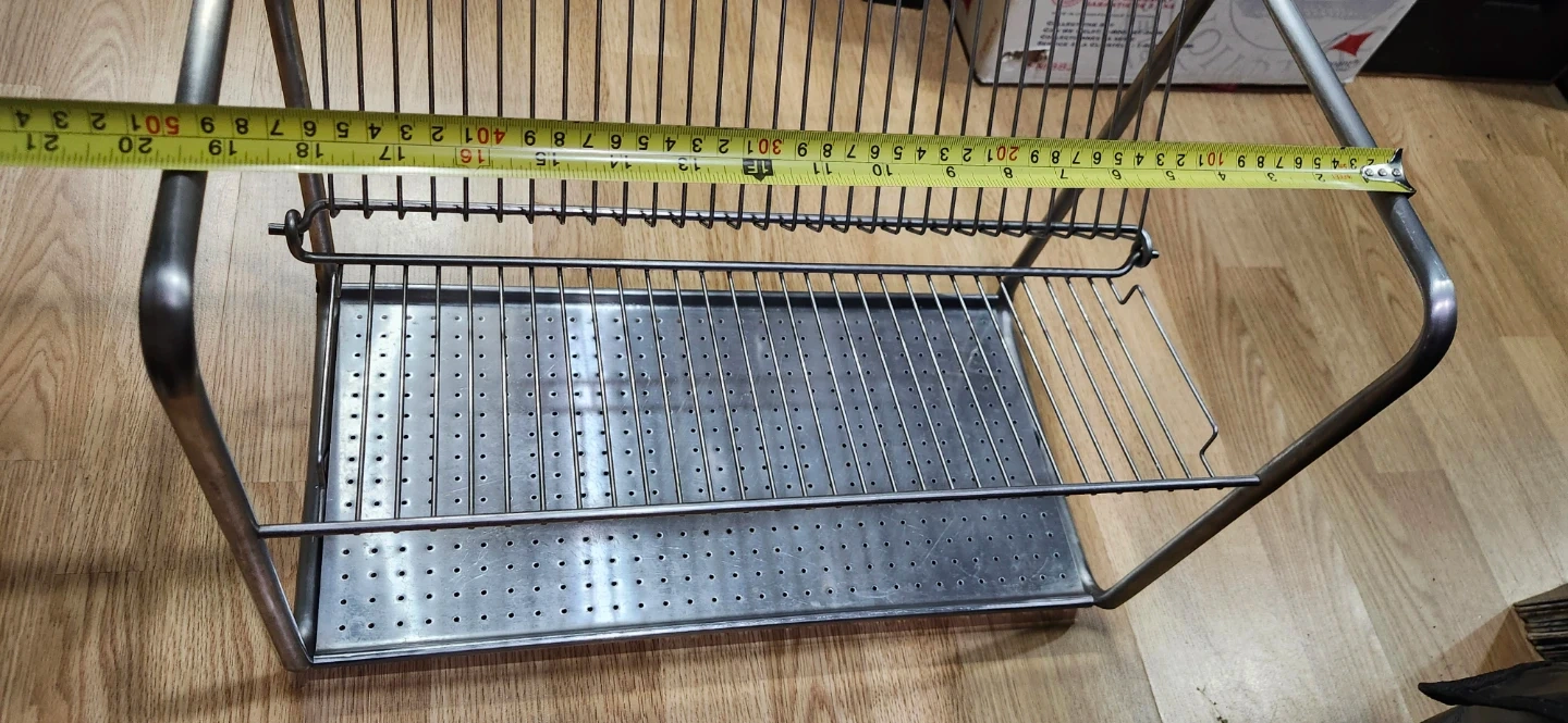 1000+USED EXCELLENT CONDITION. stainless steel dish drying rack. It's in great shape and ready to help keep your kitchen organized. The rack features a tray at the bottom to catch water and a section for drying dishes and utensils. It measures approximately 19 inches wide and 12 inches deep.