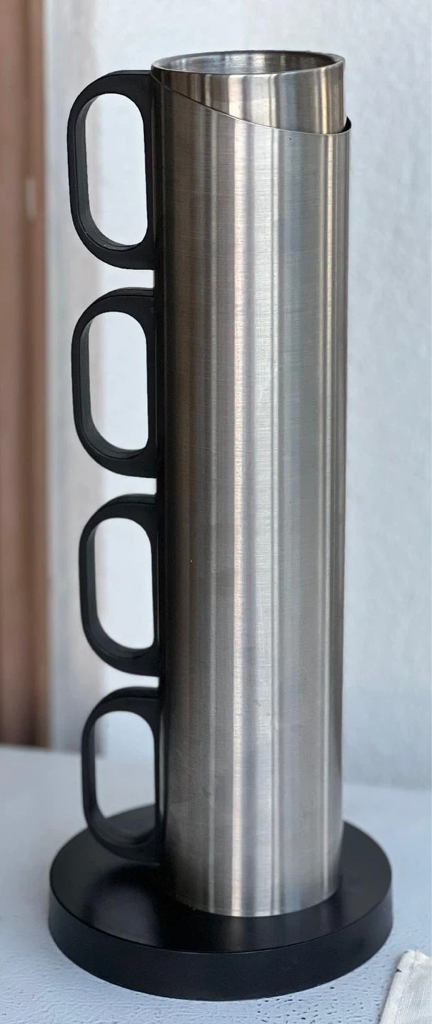 73Selling a stainless steel mug tree that comes with four matching mugs! It's a great way to save space and keep your mugs organized in your kitchen. The mugs have black handles for a nice contrast. It’s in great condition and ready for a new home!