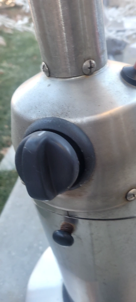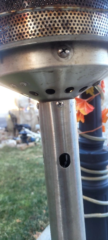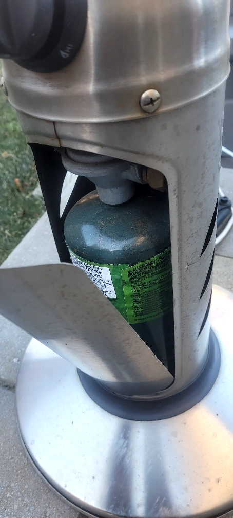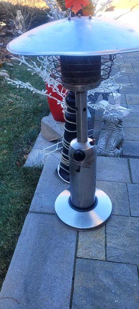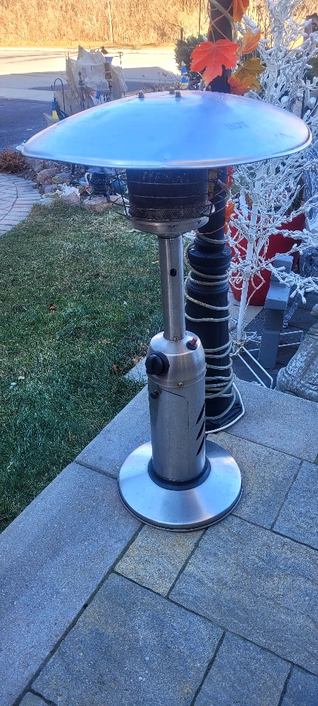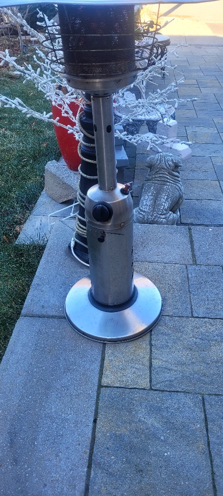62Outdoor patio heater. Stainless steel construction. Uses a standard propane tank (not included). Good condition, minor wear.