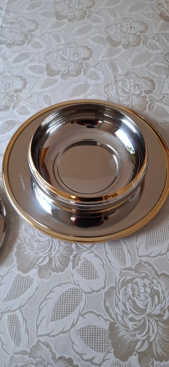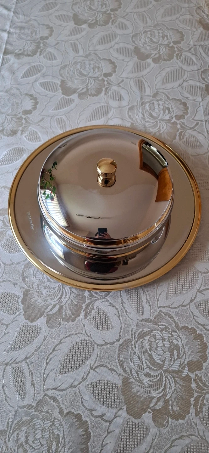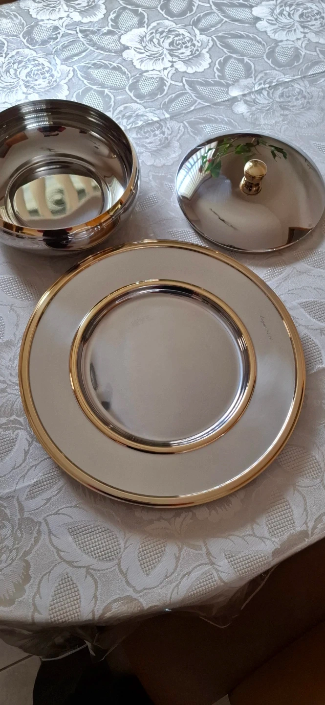 232Stainless steel 18/10 serving bowl which includes the plate, bowl, and lid. 24kt gold banding detail. It's in great condition and would make a lovely addition to any table setting. Door pickup McCowan Rd and Lawrence Ave East. Cash payment.