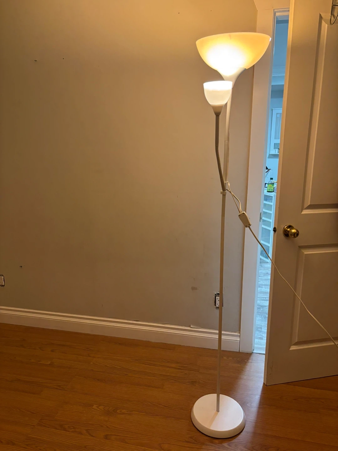 10Selling a standing floor lamp in great condition! It has a sleek, modern design with two lights, perfect for adding some extra light to any room. The base and stem are white.