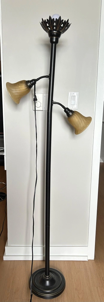 moving out sale-Here's a standing floor lamp with three lights! It features a dark metal finish and three lamps with shades that have a marble look. Perfect for adding some extra light to any room