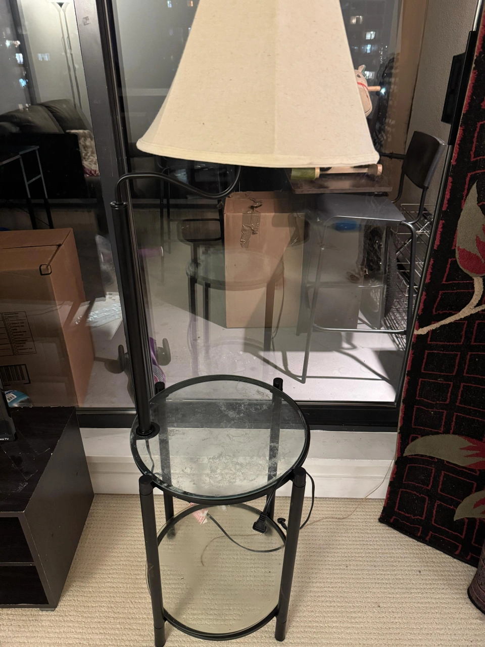 10Selling a standing lamp with a built-in side table! It features a black metal frame and glass shelves. It's perfect for adding light and functionality to any room. It's in good condition and ready to brighten up your space