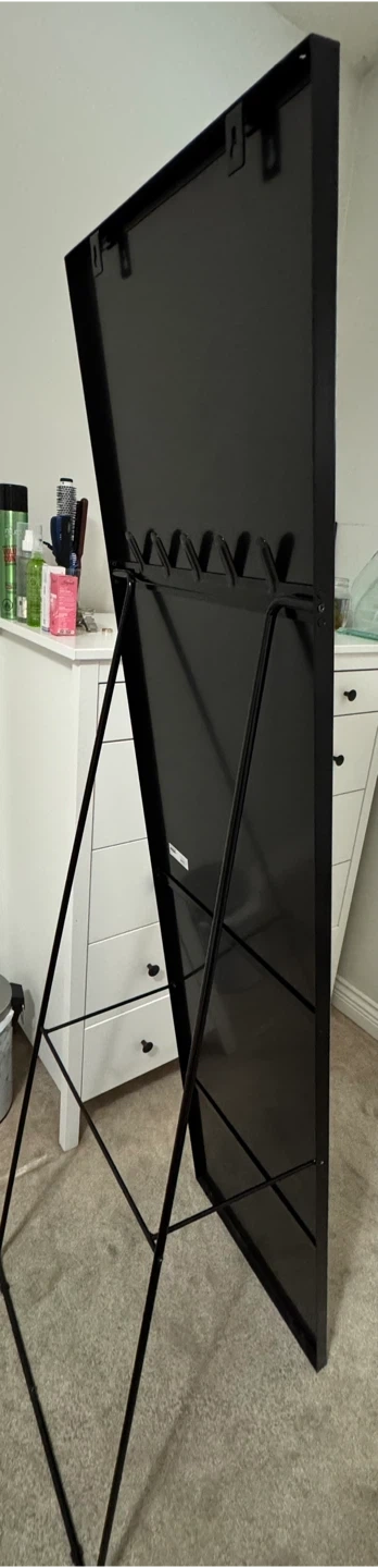 16Selling a full-length standing mirror with a sleek black frame. It's in great condition and ready to brighten up any room! The mirror comes with a stand for easy placement. Mint condition