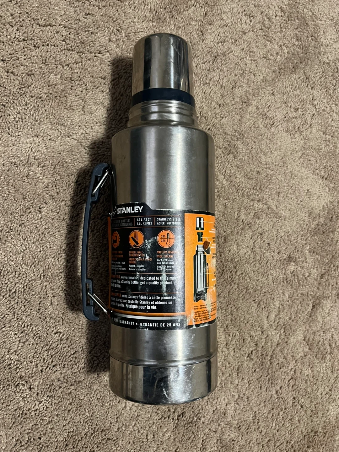 36Selling a Stanley thermos bottle. It features a double-wall vacuum insulation, keeping liquids hot for 24 hours or cold for 32 hours. It's rugged and durable, perfect for any adventure.