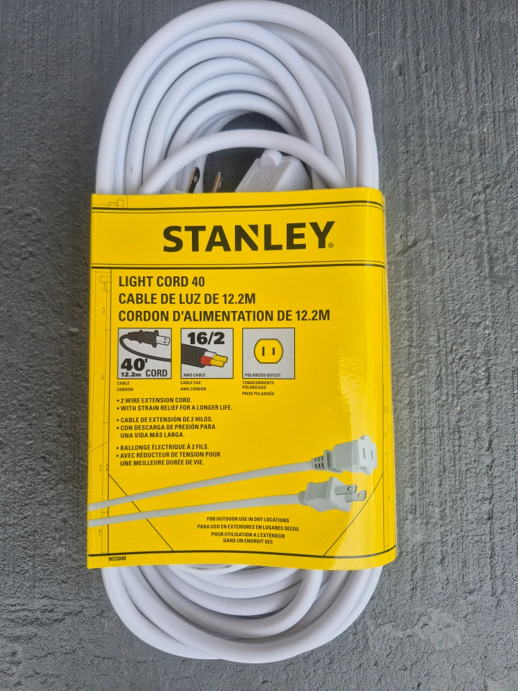 Selling a Stanley light cord, 40 feet (12.2 meters). It's a 2-wire extension cord, designed with strain relief for a longer life. Perfect for outdoor or indoor use in dry locations!