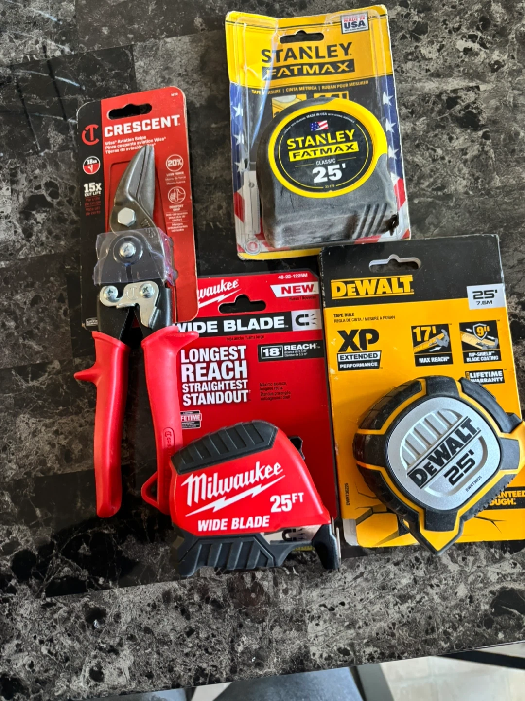 Selling a variety of new tools including a Stanley Fatmax 25' tape measure, a DeWalt XP 25' tape measure, a Milwaukee 25ft wide blade tape measure, and Crescent Wiss aviation snips! All items are new in their original packaging.